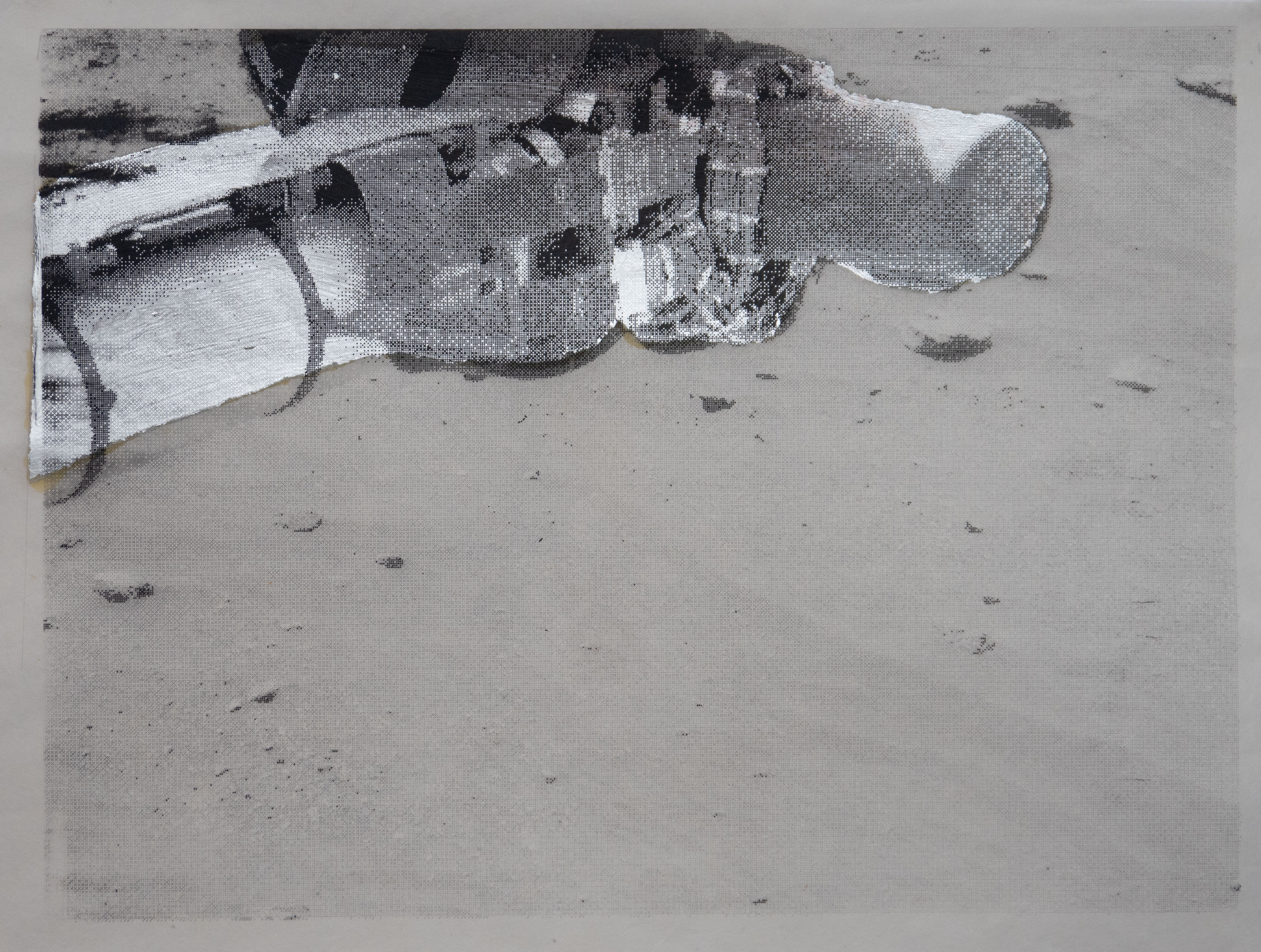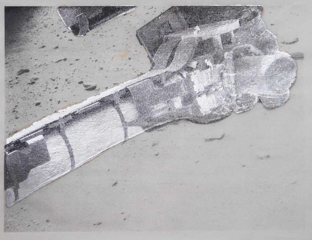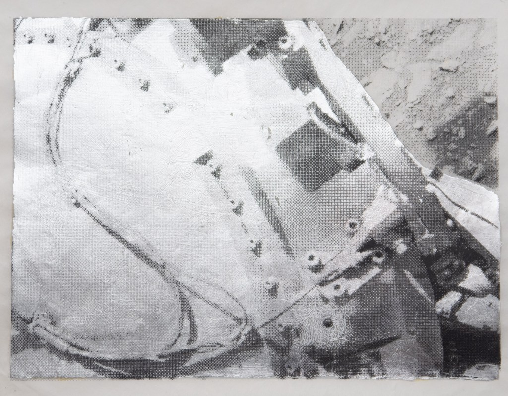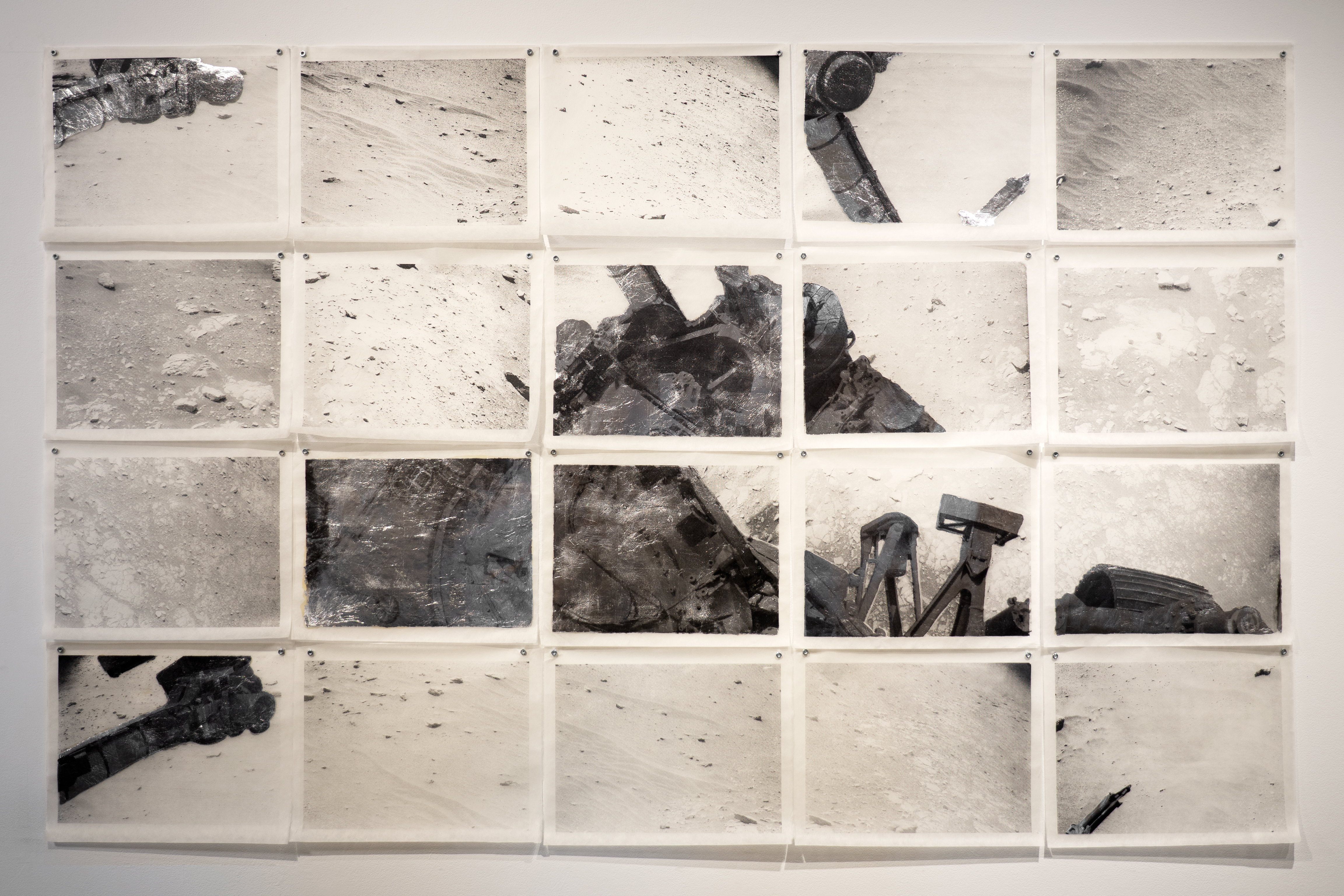 In a sequence of twenty silkscreen prints with aluminum leaf on kozo paper, I use materials to accentuate the foreign quality of the Perseverance rover on the landscape of Mars. The Perseverance is largely made of aluminum, including its six wheels. Each print in the sequence represents a moment in time. Taken together it represents a time-based grid of images as the robot arm moves through space and clicks a shutter. In this sense, the robot is a camera, a complex self-driven camera that moves through an alien landscape gathering digitally recorded memories of light waves as they move through a thin atmosphere and bounce off of the sand, the rocks, and the Perseverance itself.