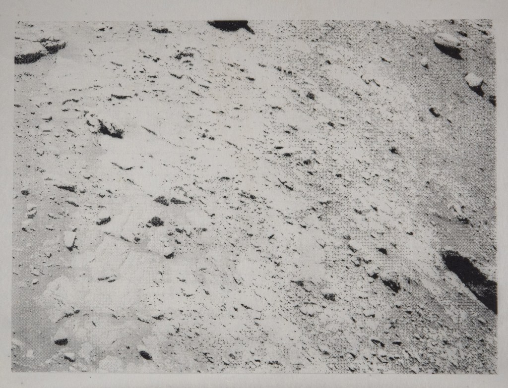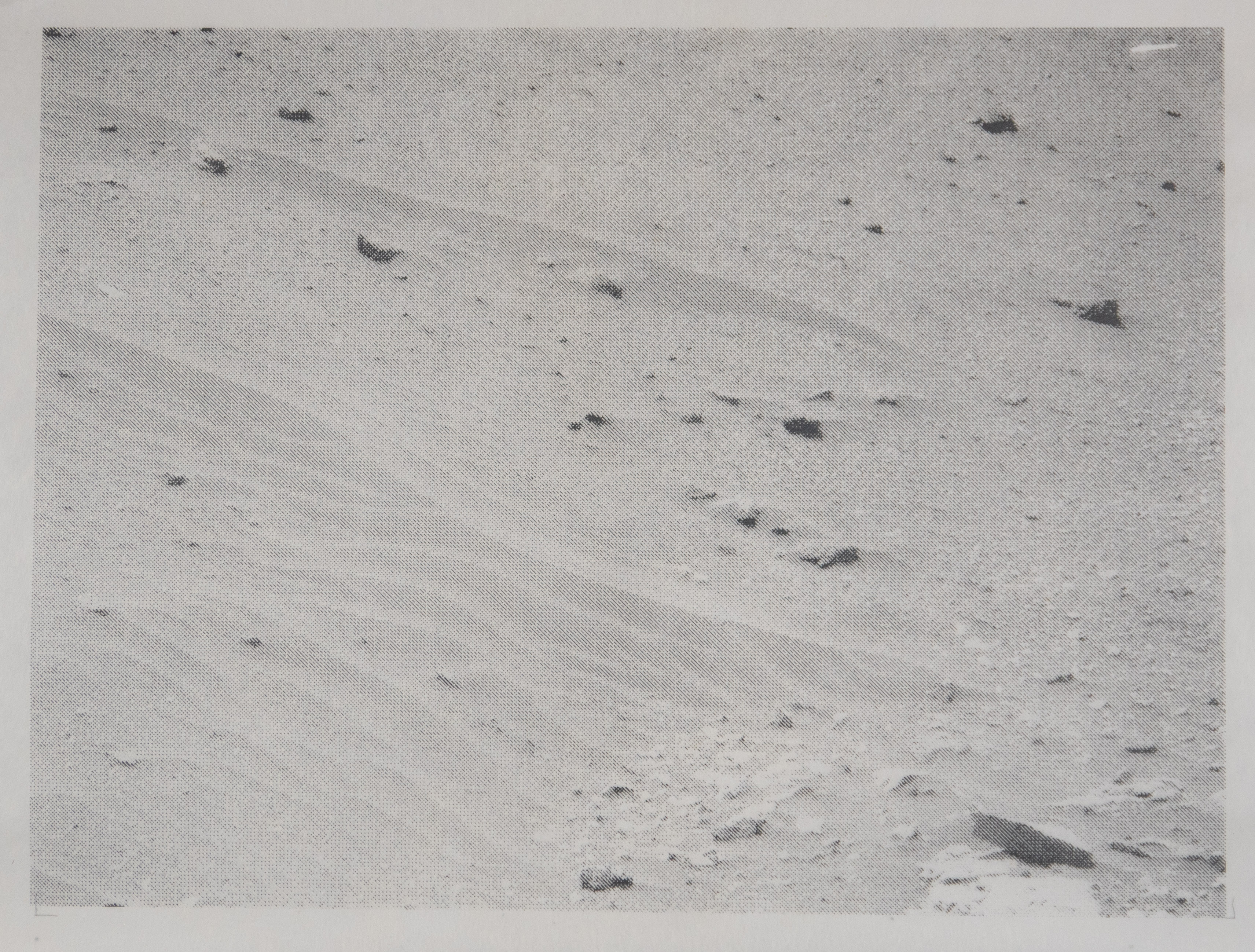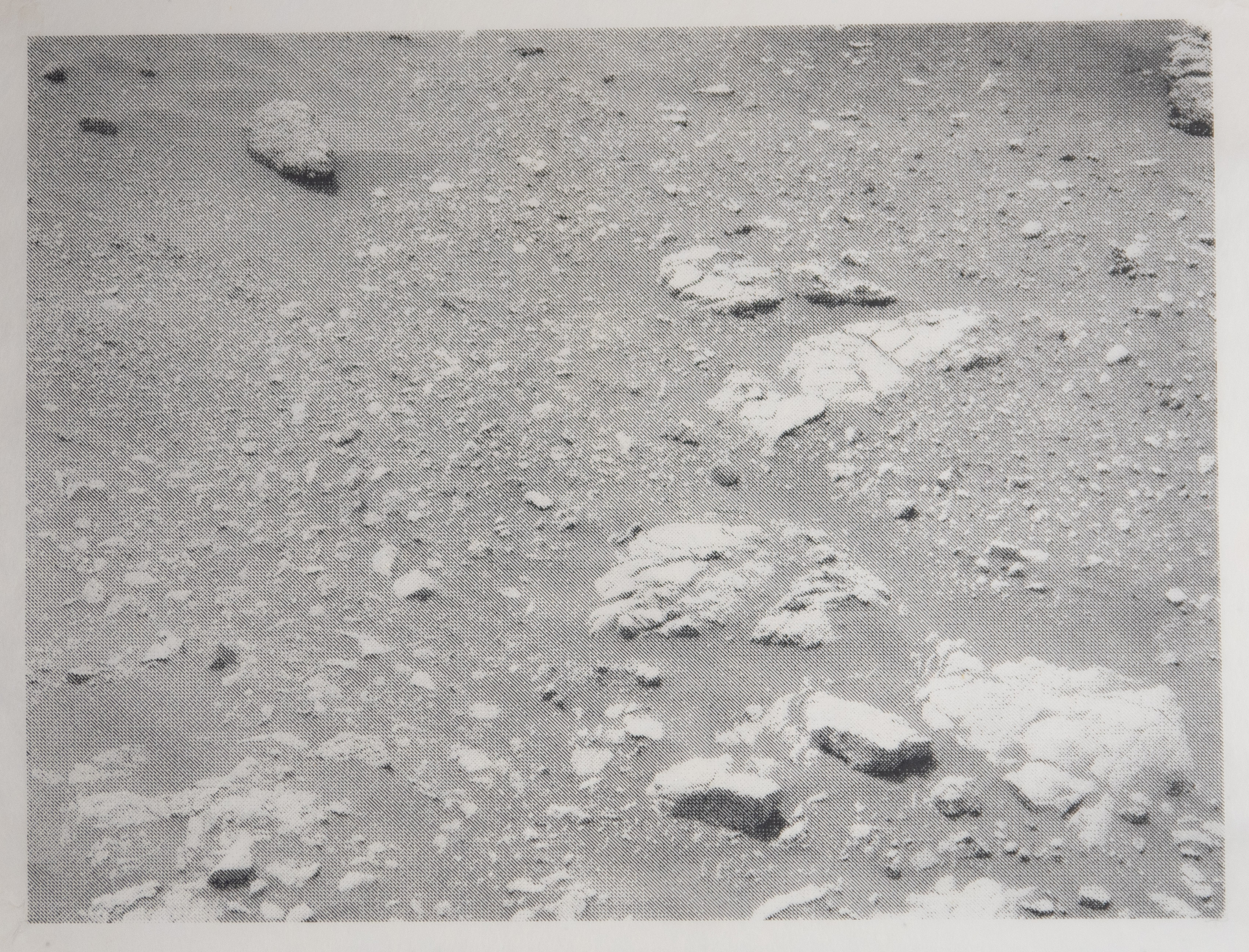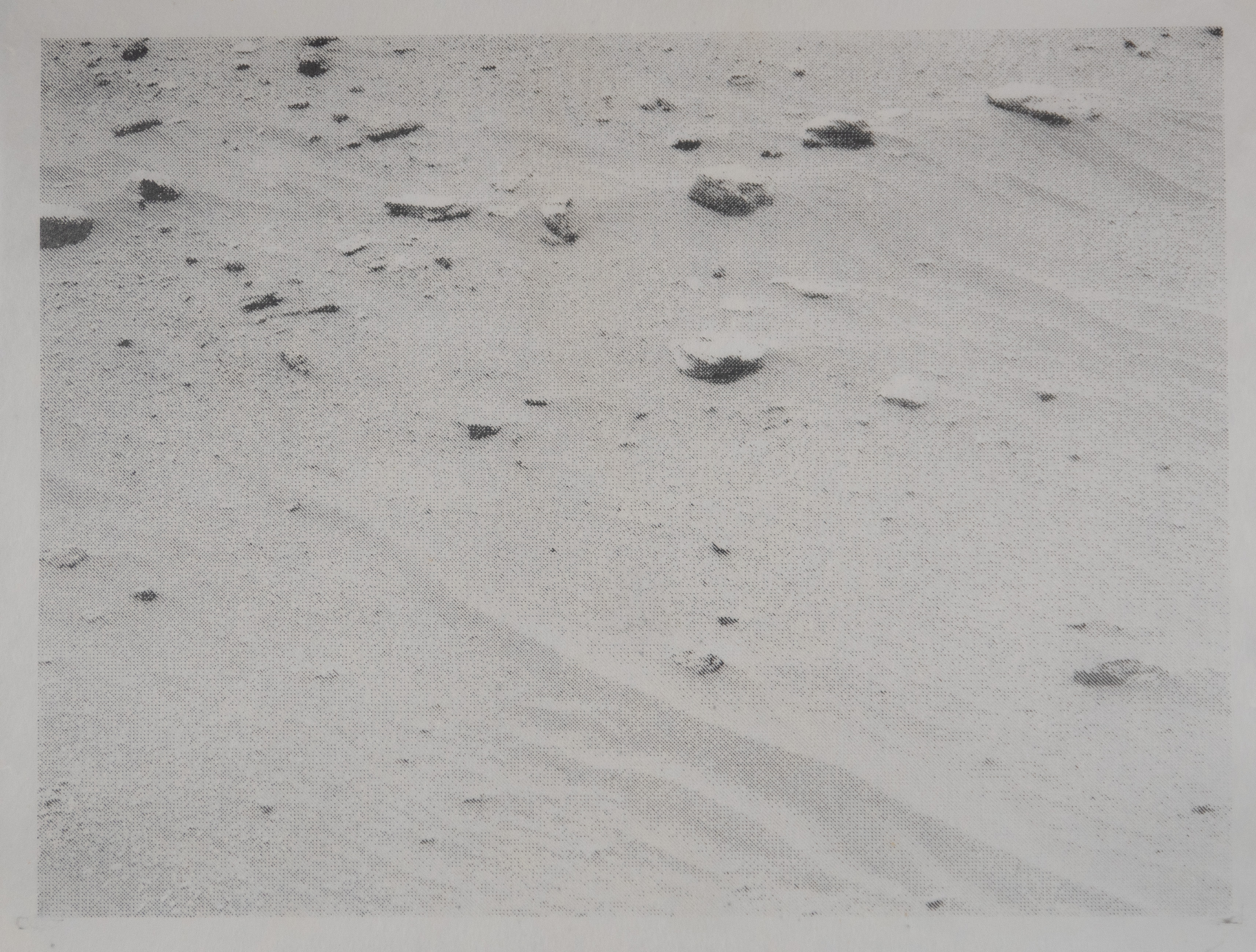 The 20 prints in this grid were taken by the Perseverance roverbot on Mars on August 14, 2022, which is my birthday. Perseverance has 2 AI systems on board, which help it decide when to capture images and when and where to dig for samples. This piece represents an attempt to collaborate with an artificially intelligent being on an alien planet. I have given Perseverance some amount of agency by preserving the order in which the photographs were taken (read from left to right), and the composition of each image. The use of aluminum leaf calls attention to the body of Perseverance and signals that some of these images could, in a sense, be read as self-portraits.