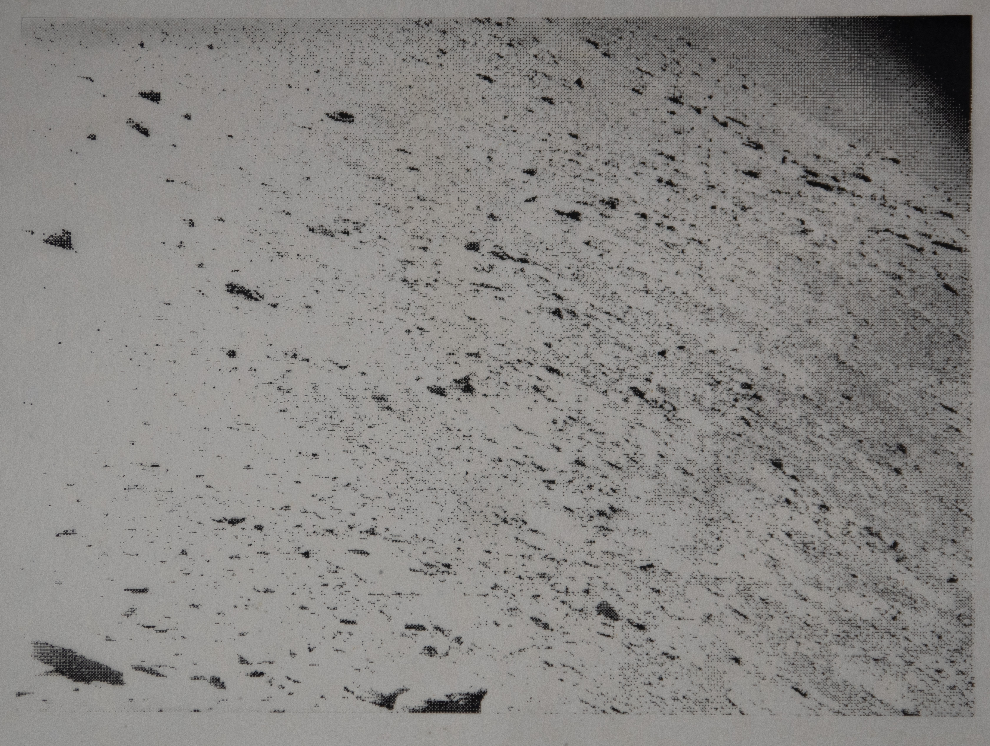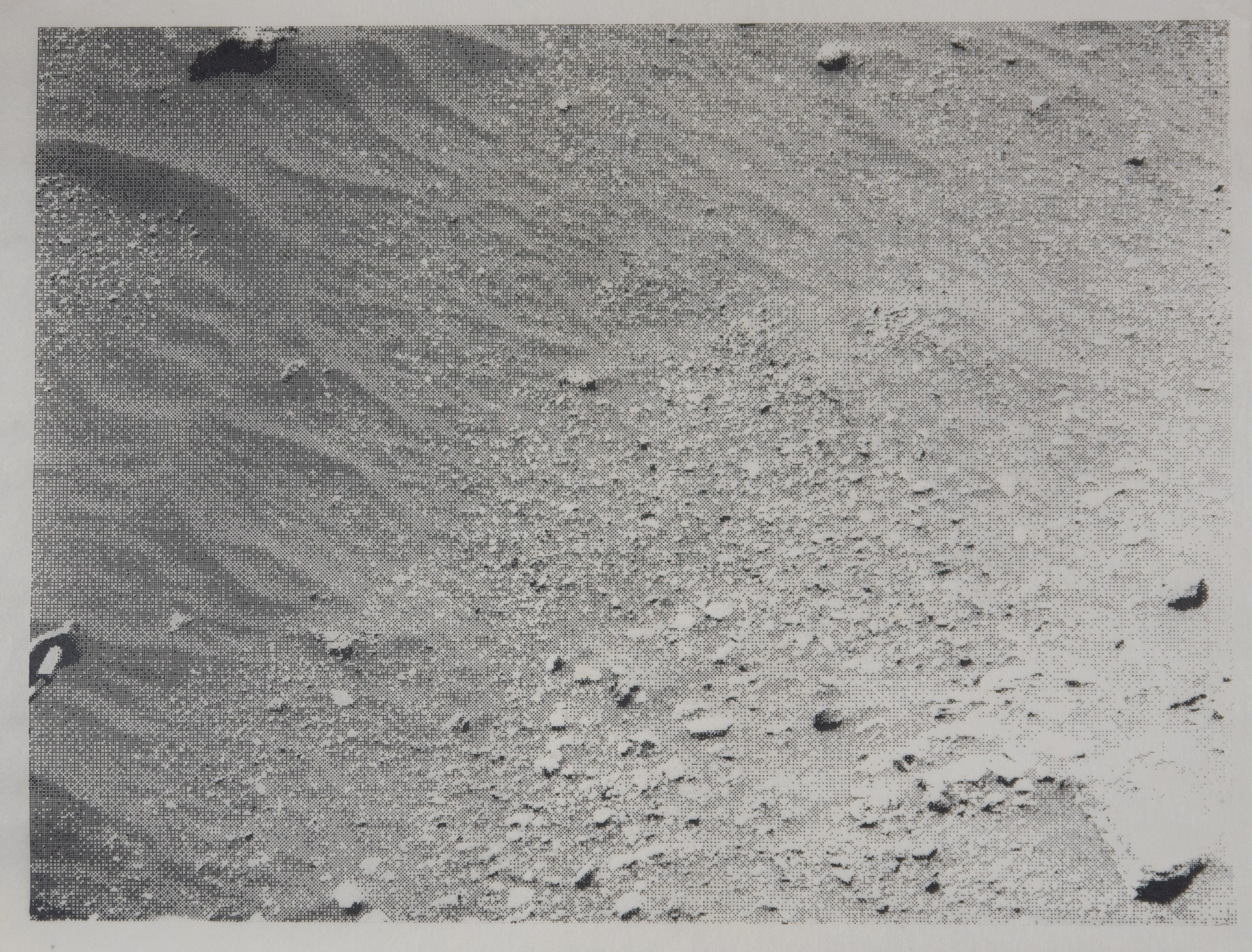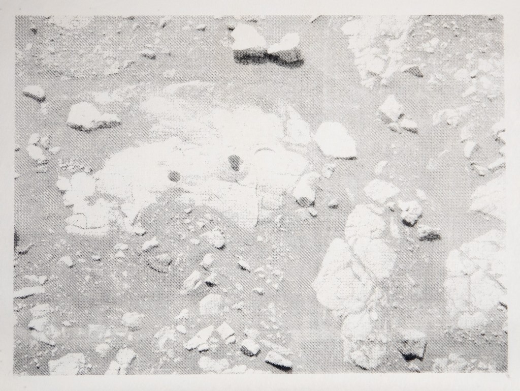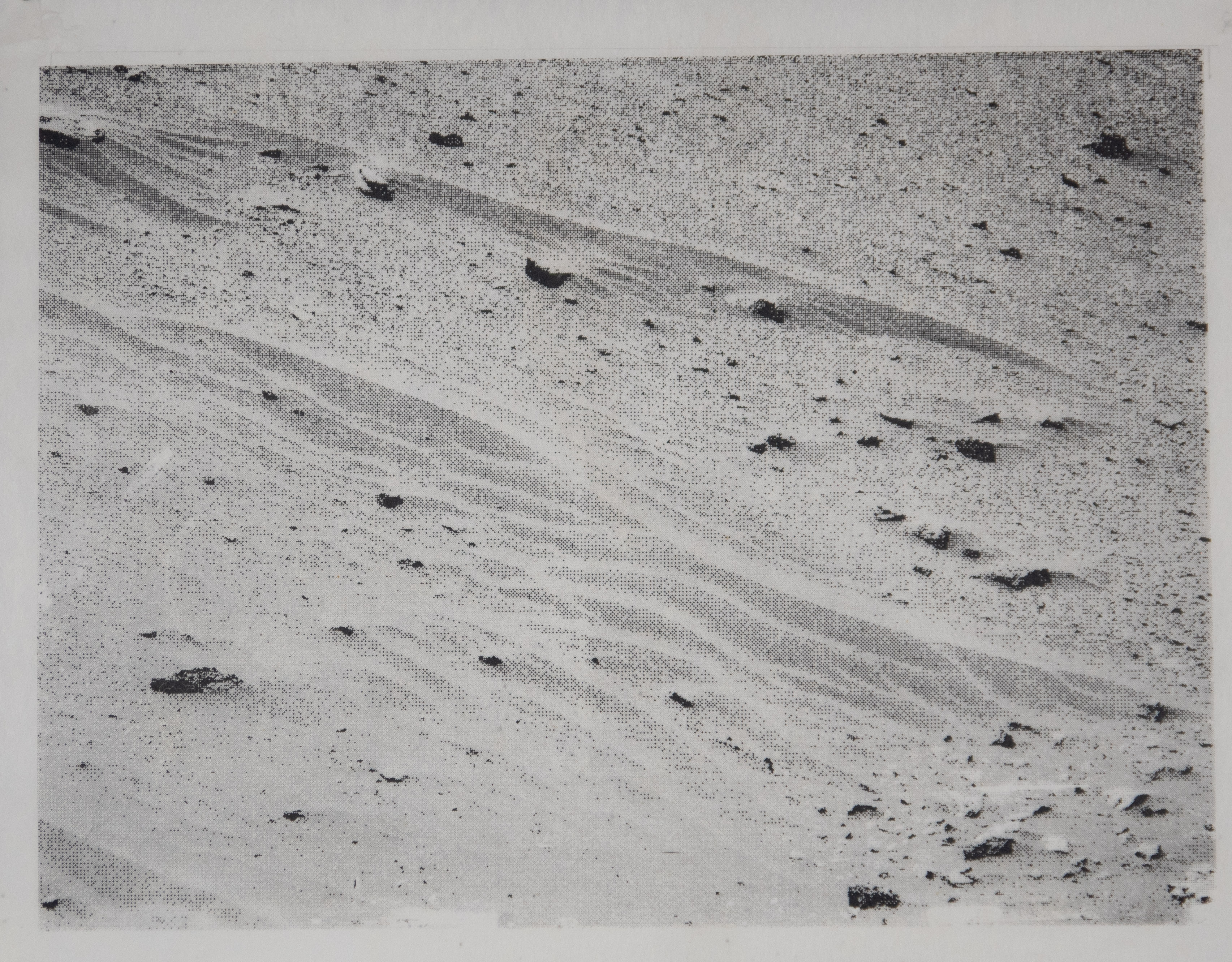 The 20 prints in this grid were taken by the Perseverance roverbot on Mars on August 14, 2022, which is my birthday. Perseverance has 2 AI systems on board, which help it decide when to capture images and when and where to dig for samples. This piece represents an attempt to collaborate with an artificially intelligent being on an alien planet. I have given Perseverance some amount of agency by preserving the order in which the photographs were taken (read from left to right), and the composition of each image. The use of aluminum leaf calls attention to the body of Perseverance and signals that some of these images could, in a sense, be read as self-portraits.