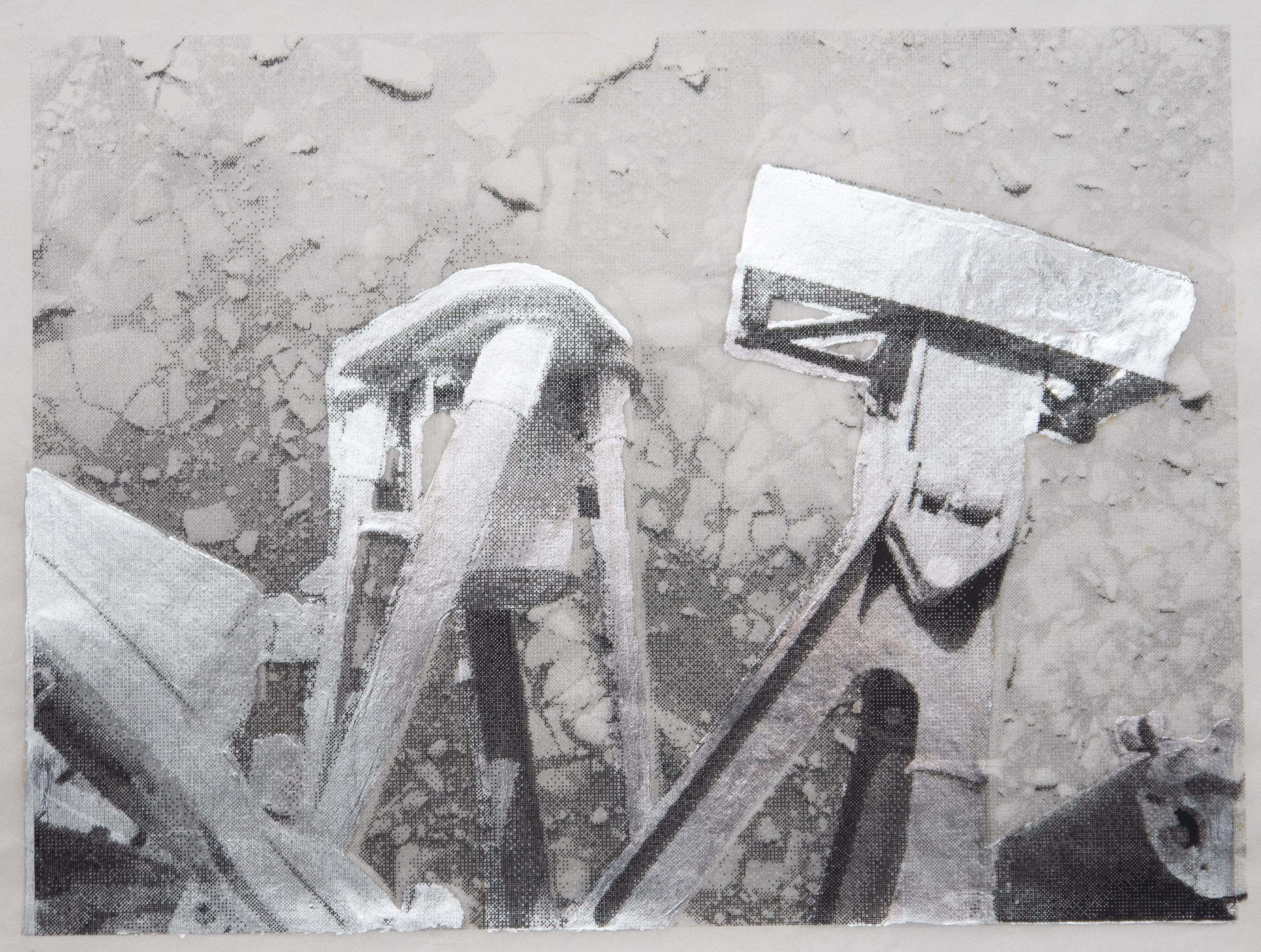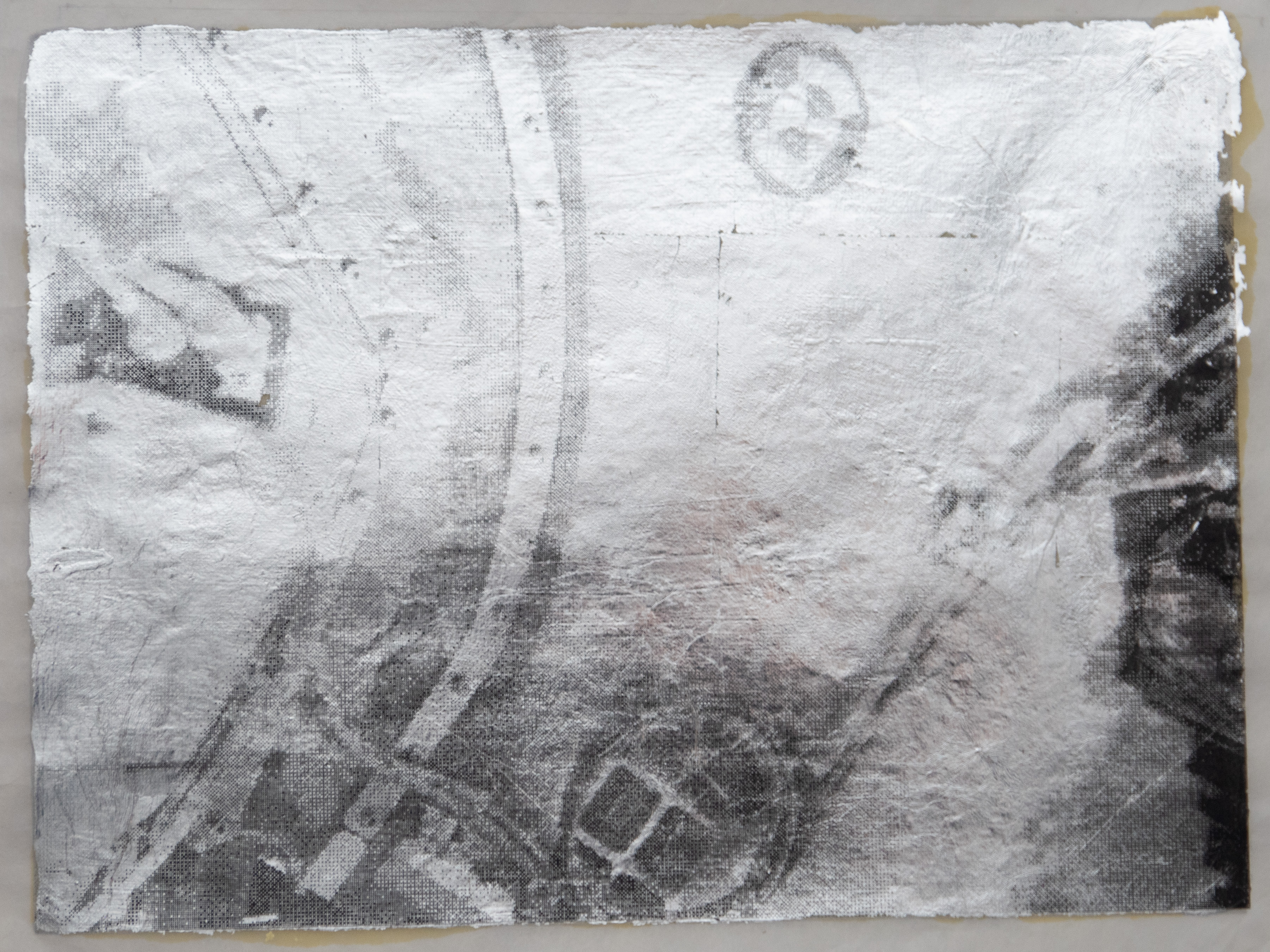 Silkscreen and aluminum leaf on sekishu kozo paper, 100 inches wide by 64 inches tall, 1 of 2. Photo by Jeffu Warmouth.