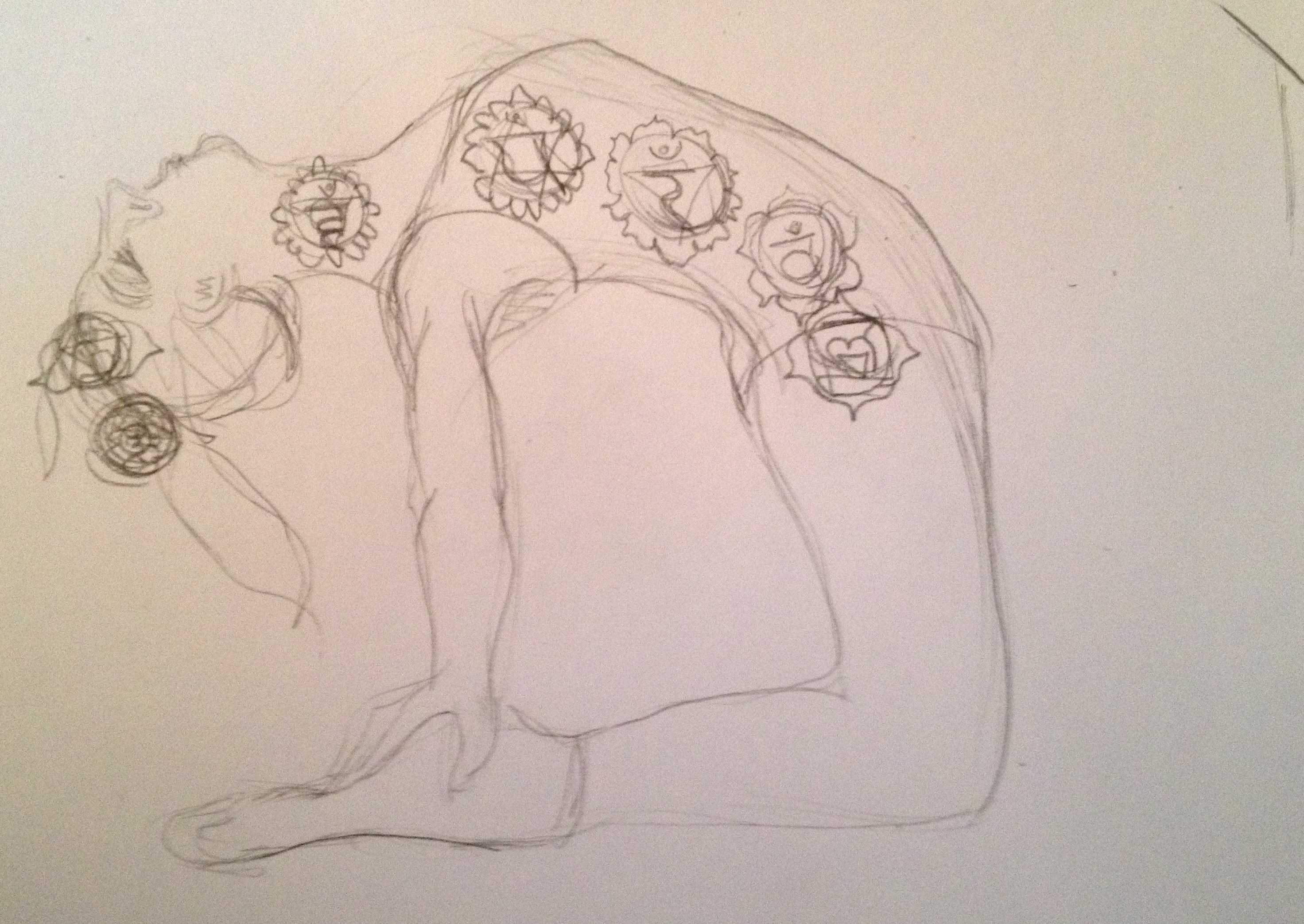 The photo below is from friday. One of my daughters took the picture on my iPhone. I wish I had a little more detail of the musculature but I can’t blame that all on the phone or the amateur photographers! I’m thinking about what will happen around/ behind Ustrasana, but in some ways that’s hard to plan. What’s my goal here? The drawing from yesterday includes the chakras. I have this old book with symbolic images for each chakra. I don’t know what they all mean. As I understand it, chakras are wheels of energy, energetic centers in the body. I don’t think of them personally as scientific reality, but they do seem to me to be an interesting way of thinking about energy in the body, how it moves and flows or doesn’t flow. I met a man recently who swore that the chakras are real and could be clearly felt in the body. All I know for sure is that something happens when you start bending backwards, emotional energy is released and people often cry and meltdown. In a good way.