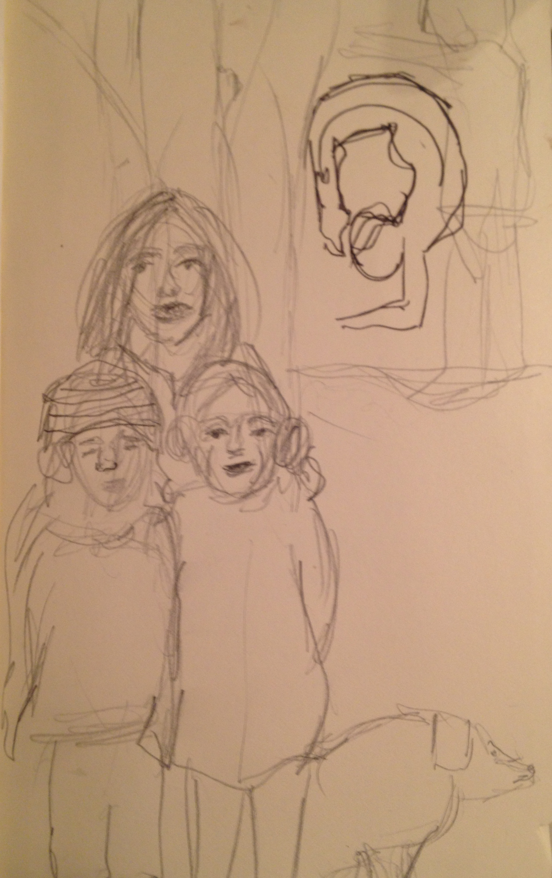 We took the dogs for a walk, and my kids all took a moment to pose. I’m at the end of this moleskine notebook, so the sketch in the upper right is a yoga pose I drew in an attempt to explain something to my husband.