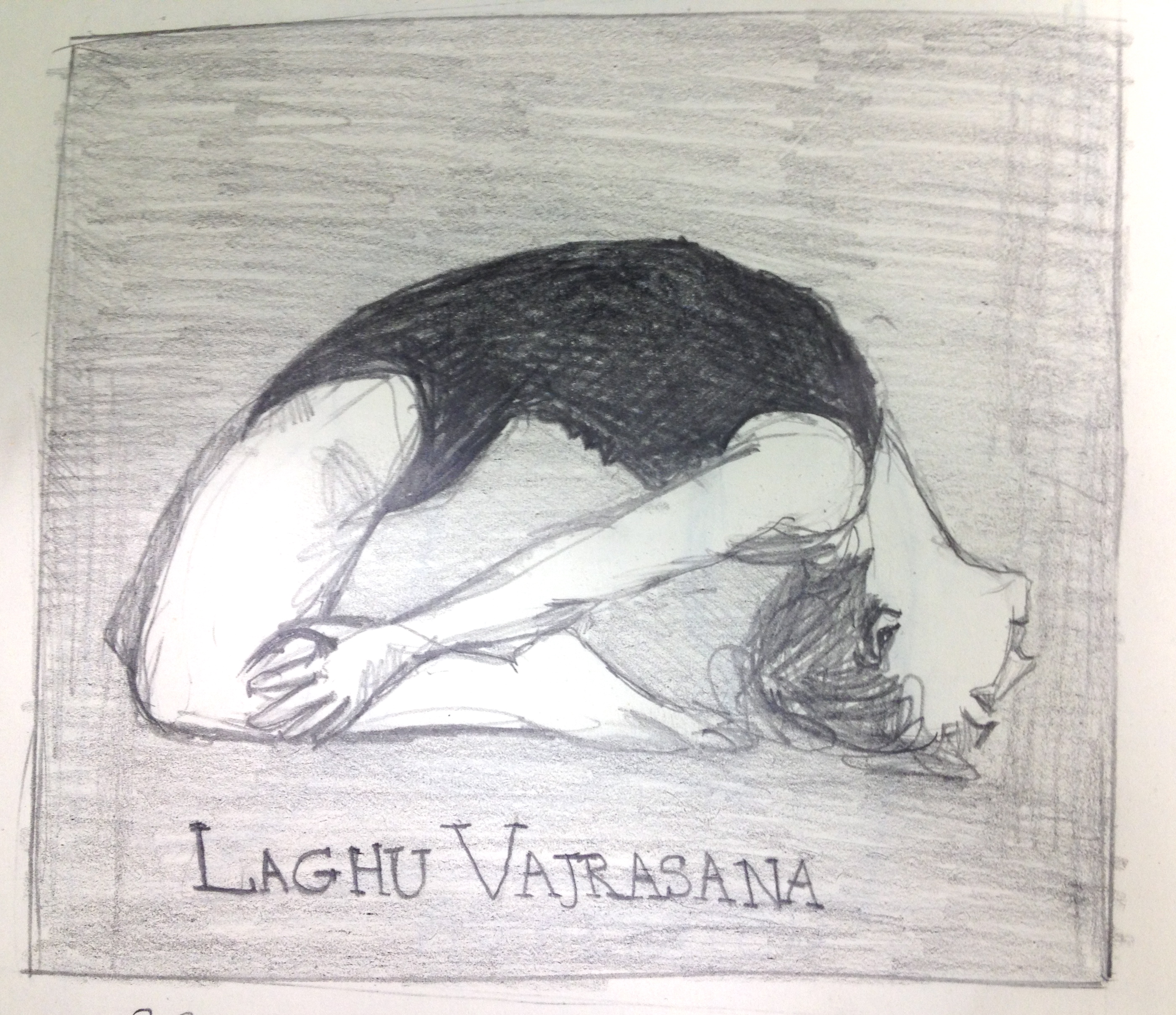 This sketch, done while 2 of my 3 peeps were in gymnastics, is the 2nd pose or Lagu Vajrasana. I forget what that means. It is a very difficult quadricep burning backbend. So the name might mean fire in the quads, but I doubt it. And once you get your head to the floor, you’re expected to come back up the same way, not collapse to the floor. Good luck with that.