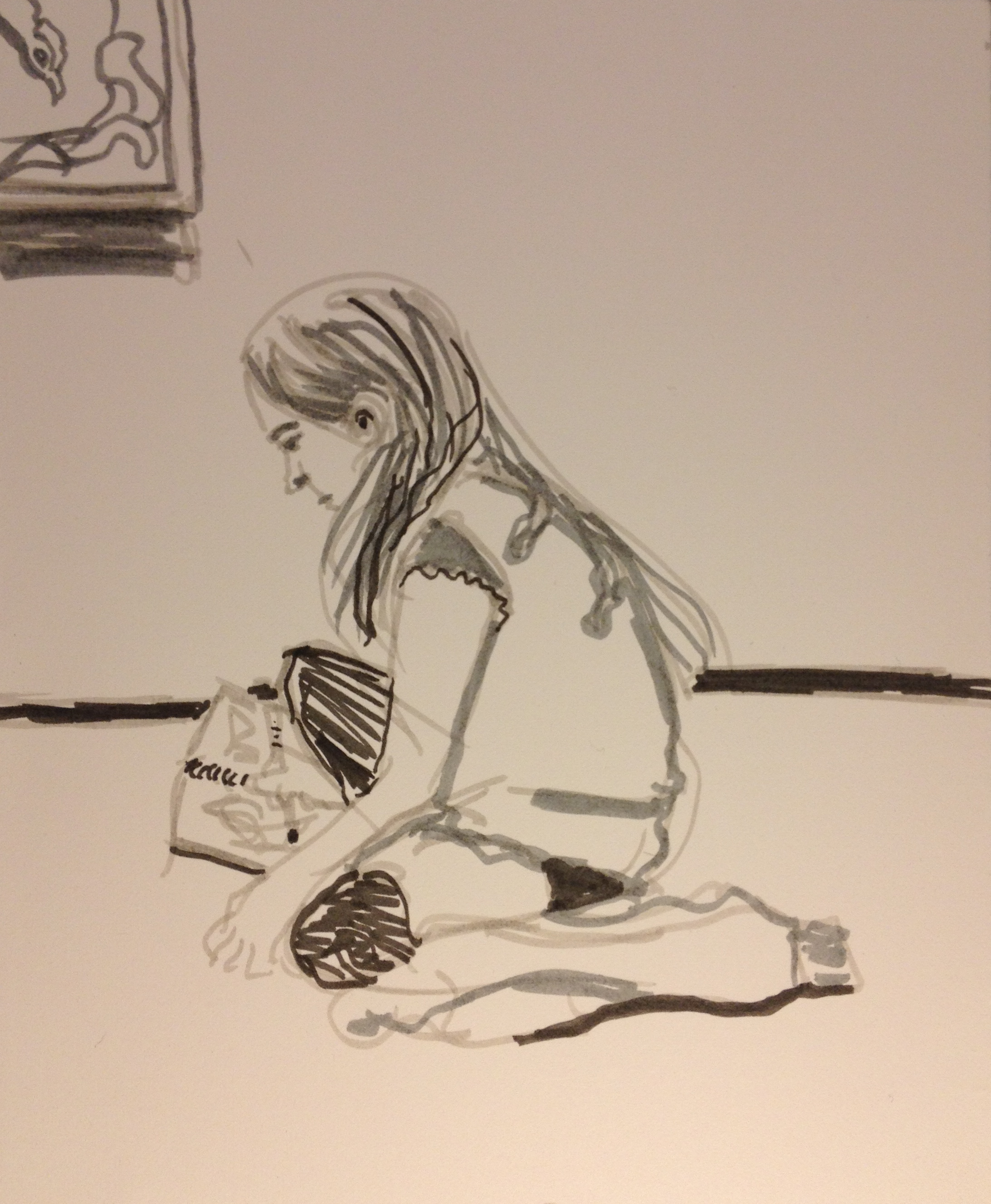 Too bad that arm looks a little rubbery, not so attached to the shoulder.  We went to the MFA today and they had a marvelous Paper Zoo exhibit Curated by Cliff Ackley.  They had a marvelous ink drawing (I think) of a porcupine by Leonard Baskin that both girls got a kick out of drawing and a gorgeous print of trout in the water by Neil Welliver, who I just adore.  I didn’t get to draw yesterday so I did two today to make up for it.  Vacation week!!!  I am having a wicked time making a drawing of my middle daughter into a likeness.  In this one I think she looks more like her older cousin.