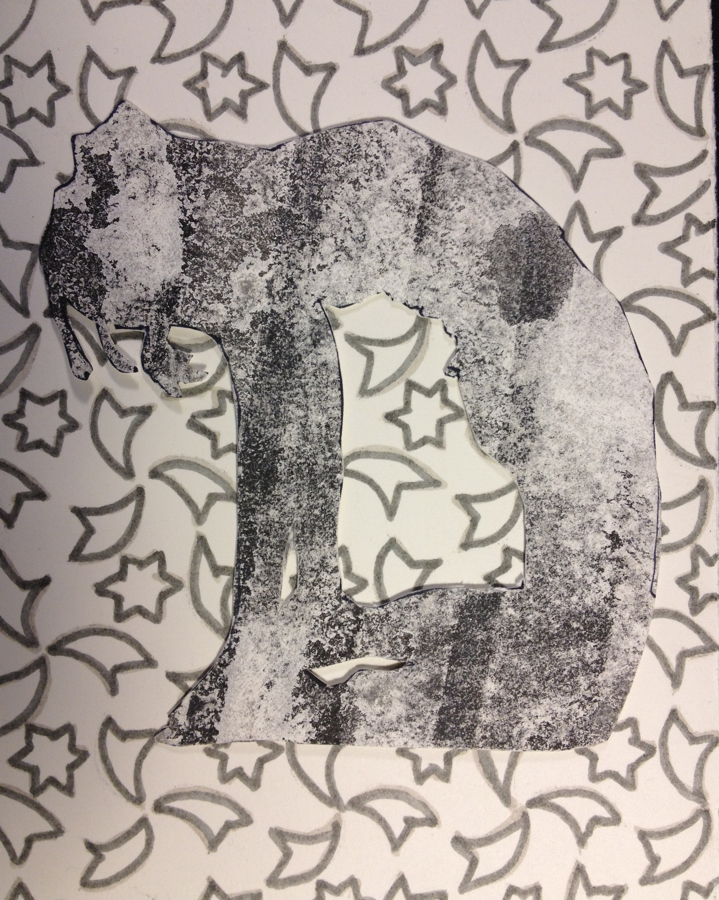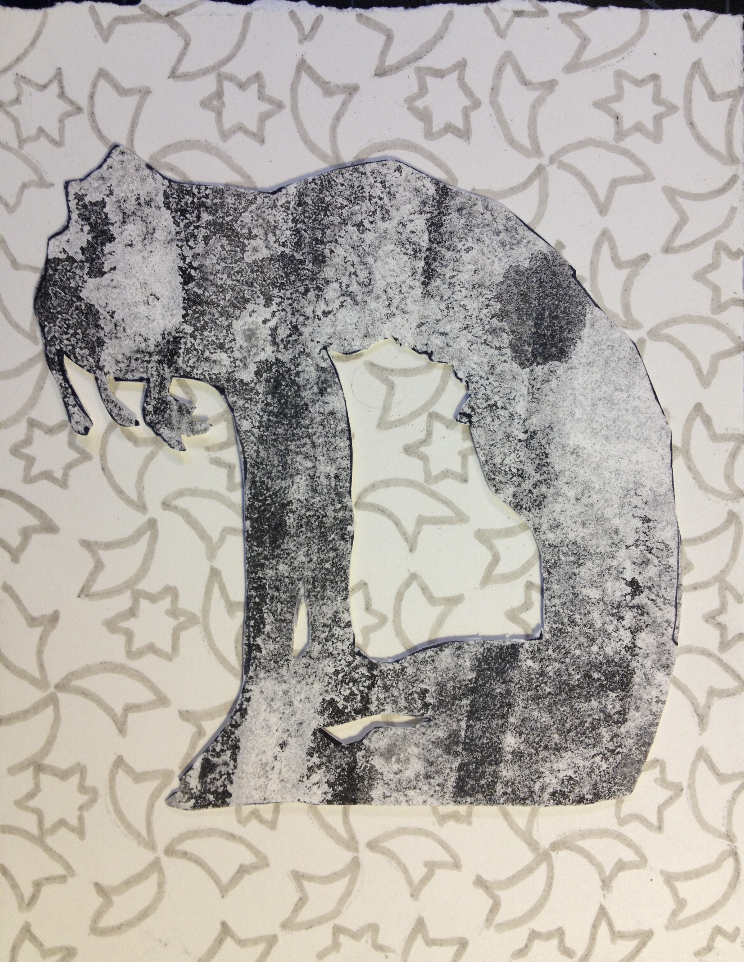 I might even go darker, or make the background dark gray/black. I don’t have so much of the paper the stencil is made of. How did I make that paper? I think it was some kind of gouache and India ink technique. Perhaps I can find the instructions somewhere.