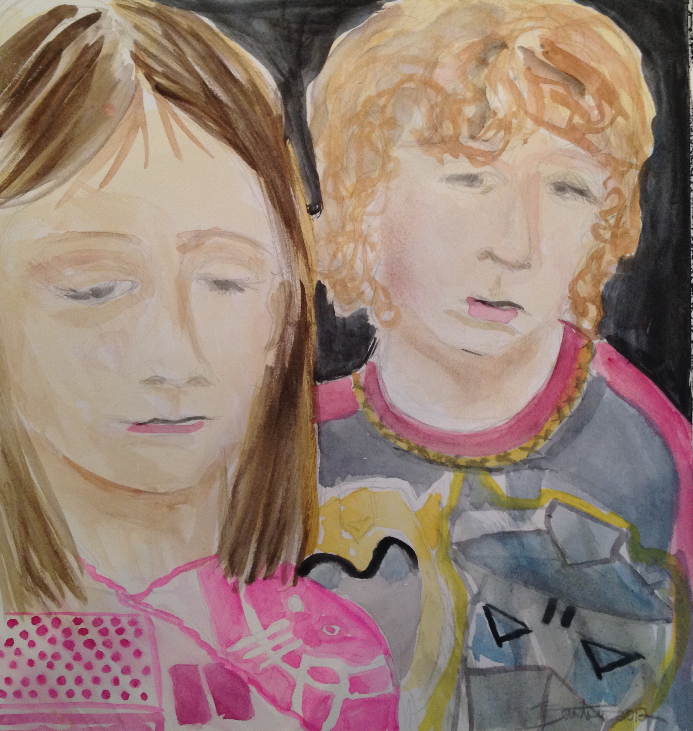 Home today, with one girl sick and the boy wanting to do something other than watch it rain.  So we got out the watercolors, for a start.  I promised my creativity coach I would get started on 15 minutes of drawing a day again, and today I met my quota.  Actually, I promised myself.  I’m getting ready to put up a Summer Drawing Show exhibit at the library, and for the first time in 5 years as curator I will be including a few of my own drawings.  I think it has been about 7-8 years since I have exhibit my work in public.  Too long.