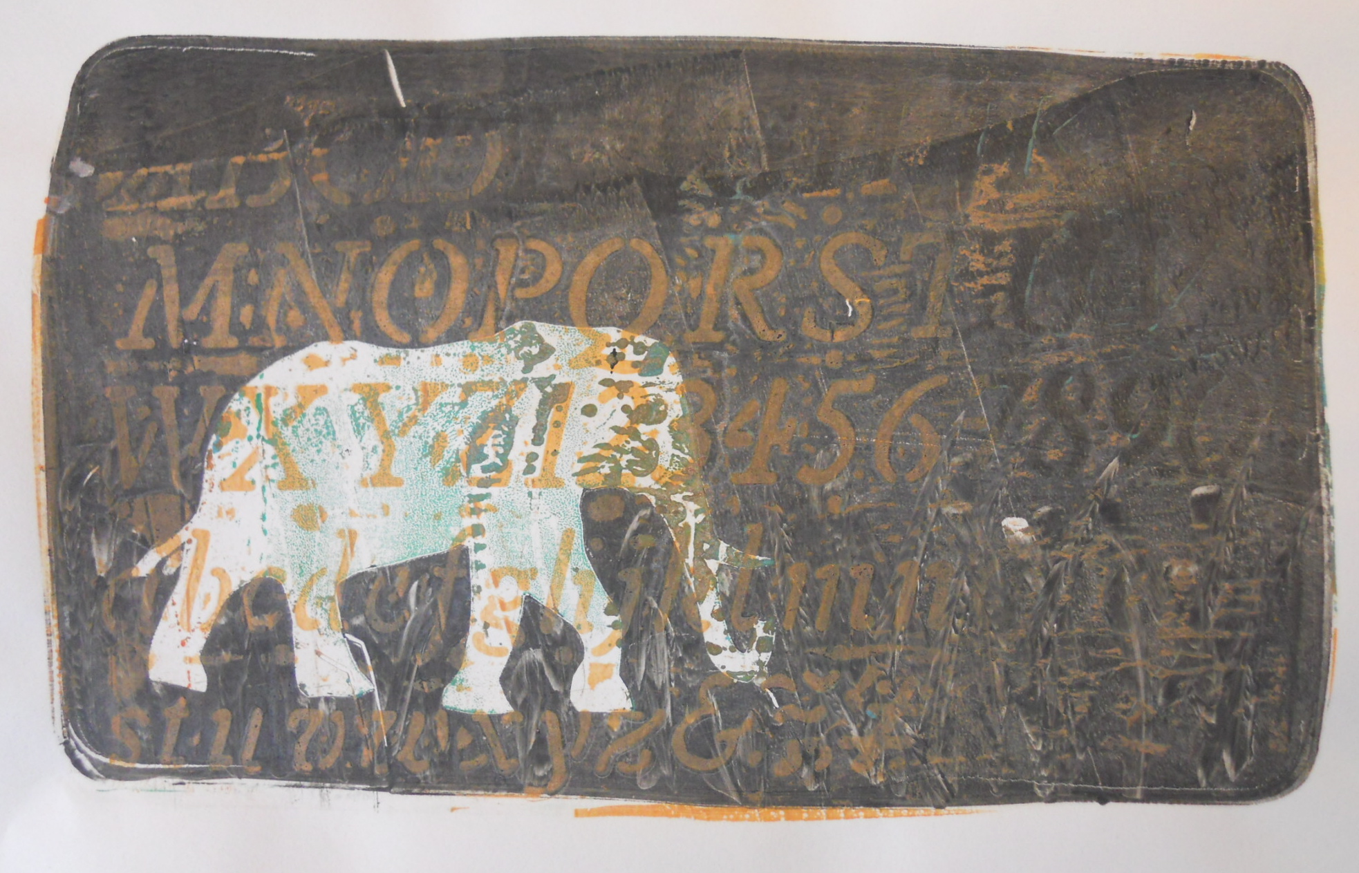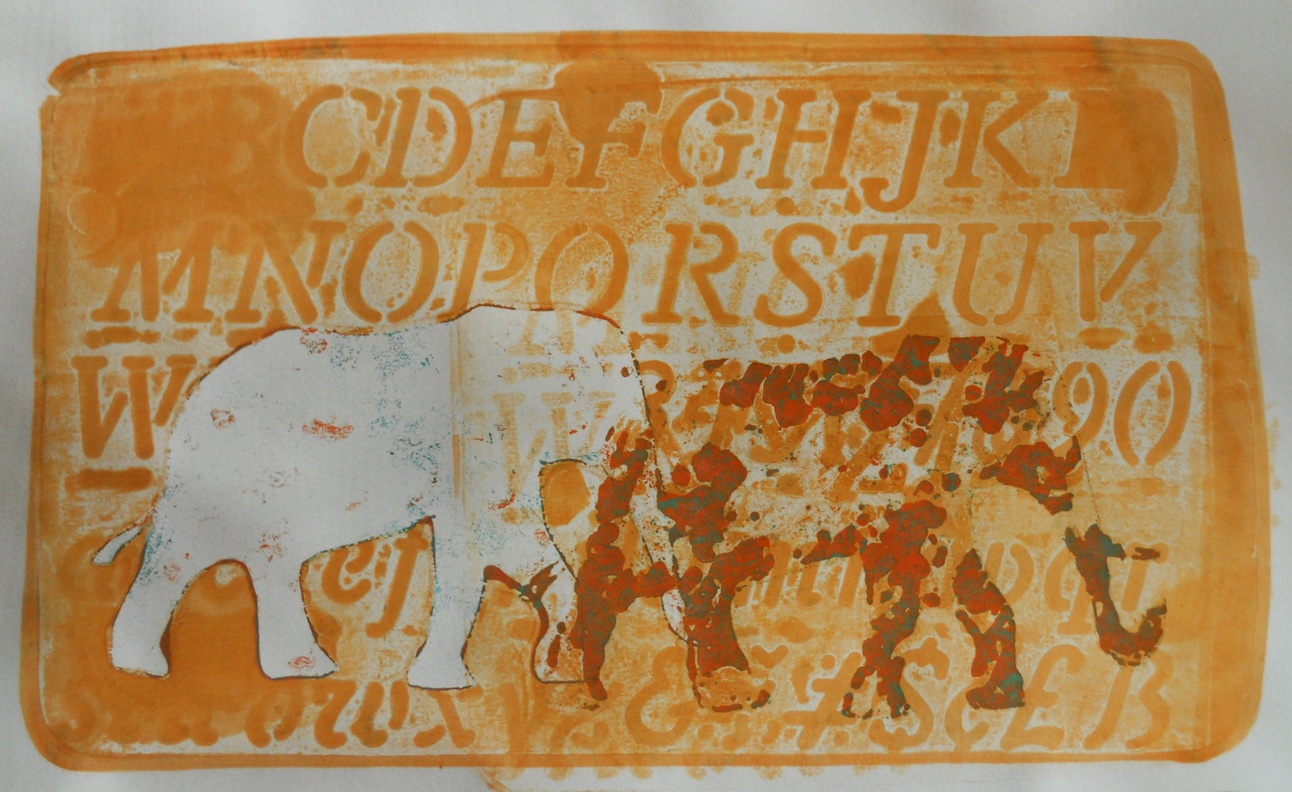 This is a riot.  All I did was trace a picture of an elephant from a Jane Goodall book for kids, on acetate, ink it up and print away.  You can see that I’m obsessed with the alphabet stencil.  I love the way the letters and symbols are the building blocks for a language, in a similar way that yoga poses are the building blocks of a yoga practice, and simple images can be the building blocks of a visual language.  I’m still having problems getting the ink to adhere and release properly from the acetate stencils so I’m going to have to come up with something better.  I can try a sturdy paper and coat both sides with gloss or matte medium.  That’s next.