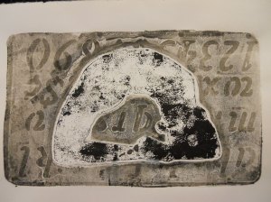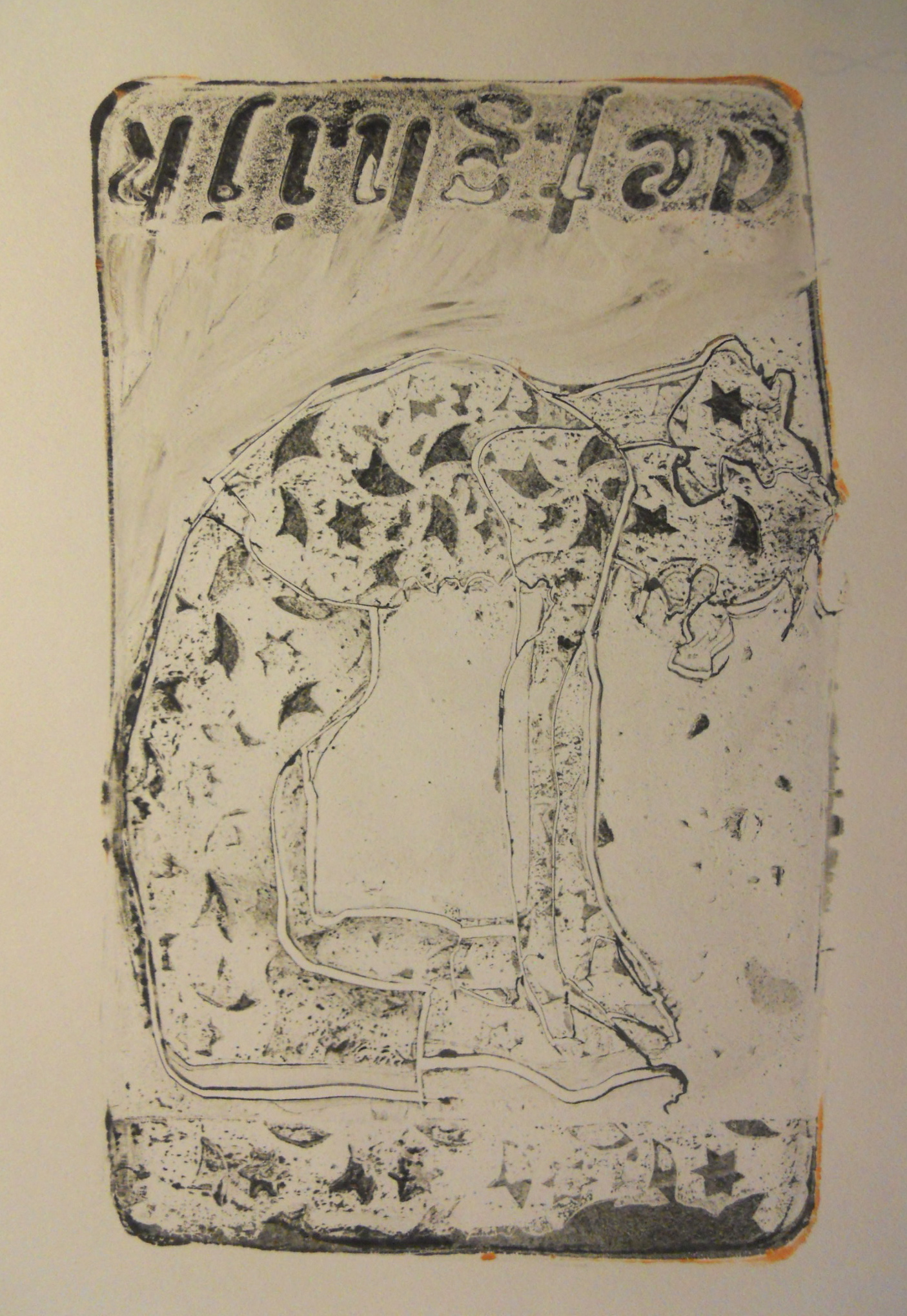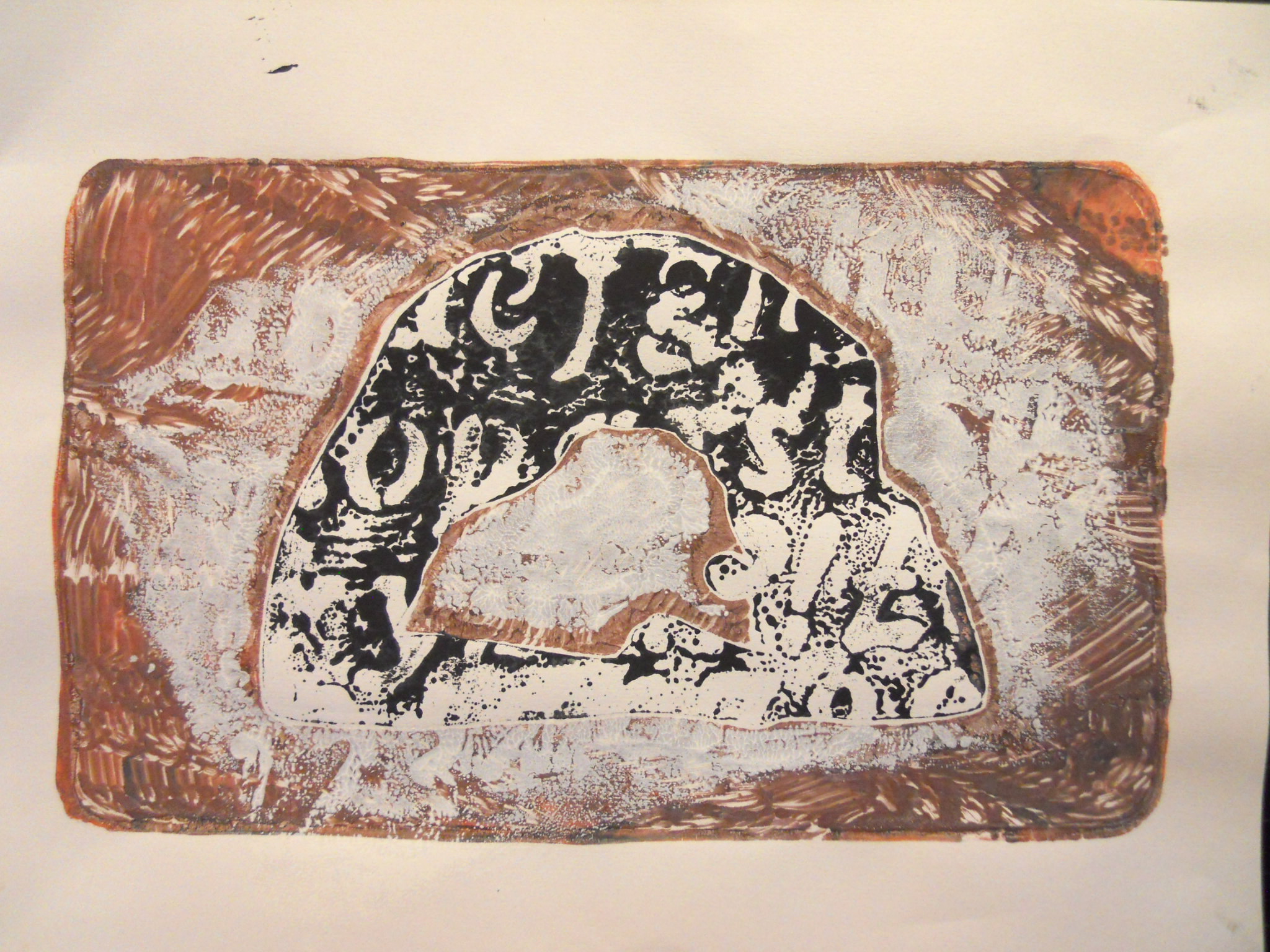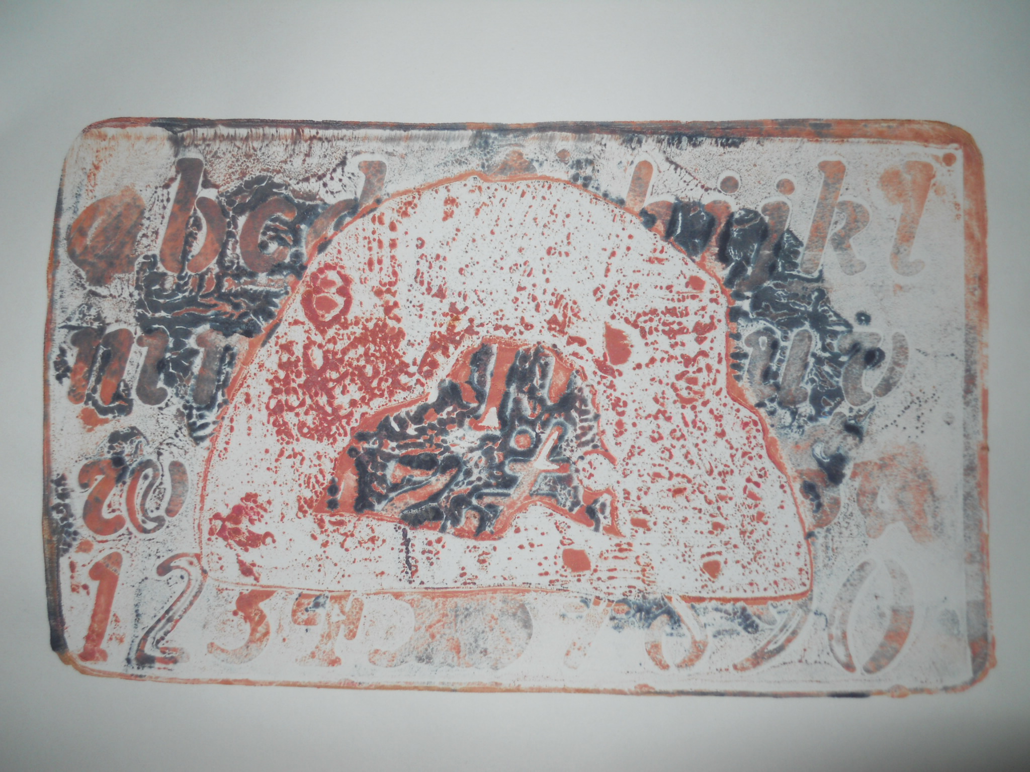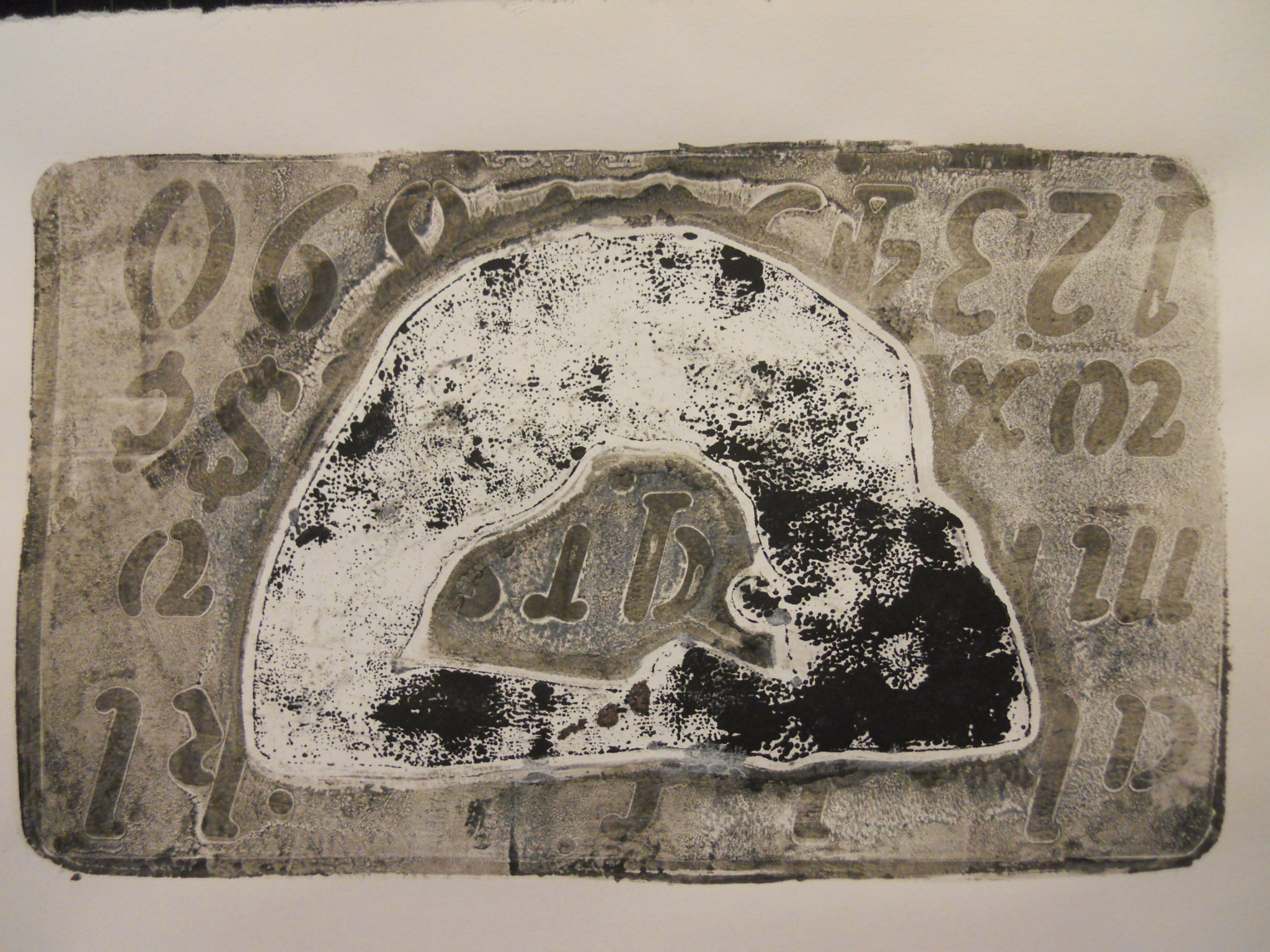 This one is my favorite.  The letters printed upside down don’t read so letter-y.  The stars and moon pattern is from a cardboard plate from the Provincetown workshop.  I probably should have reworked the bottom before printing, but I love the detail in the figure.  That’s what I’ve been trying for all this time.  How did I do it?  I need to take more notes while I’m making these because I forget.  Let’s see.  Oh yes, I made a stencil and carefully saved all of the pieces.  Unfortunately it was on this horrible curling when wet translucent paper I bought this Summer, so I had to throw it out after one use.  But I was able to ink the plate and block the area outside the figure, than press the pattern onto the inked figure that was cut into the gelatin.  You see?  Maybe not.  I can really see the point of making videos of these processes.