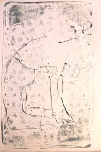 Now this one, you see those black lines?  Trying to get those fine black lines with a gelatin print is not all that easy.  I’ve been reading about a method of offset printing with an acrylic plate, but haven’t had that much luck with my Provincetown plates and I don’t have any more acrylic plates.  This figure is the ghost (or second print) from the gelatin plate.  The hand and foot area is fuzzy because it’s tricky cutting fine detail in jello with a regular exacto blade.  I need something akin to a pumpkin carving blade.  Come to think about it, perhaps I can find them for cheap at Target or CVS!  I’d be willing to bet those cheap knife sets work a whole lot better with gelatin than they do with pumpkins.  I’m also thinking of buying some plates, either acrylic or they have these foam plates.  Or perhaps I’ll try my hand at cutting linoleum plates.
