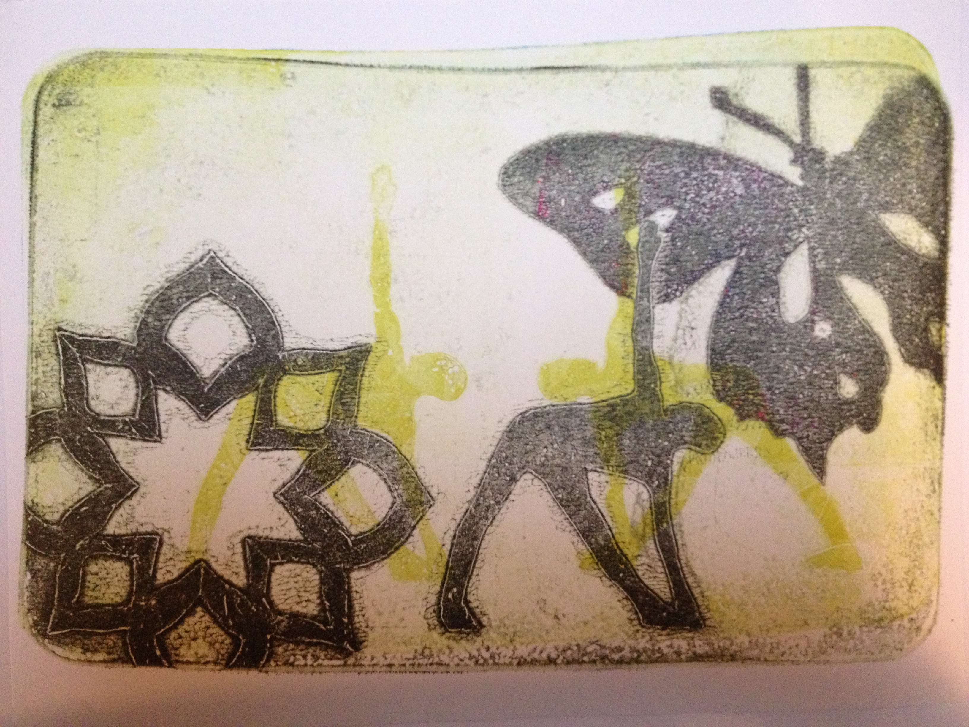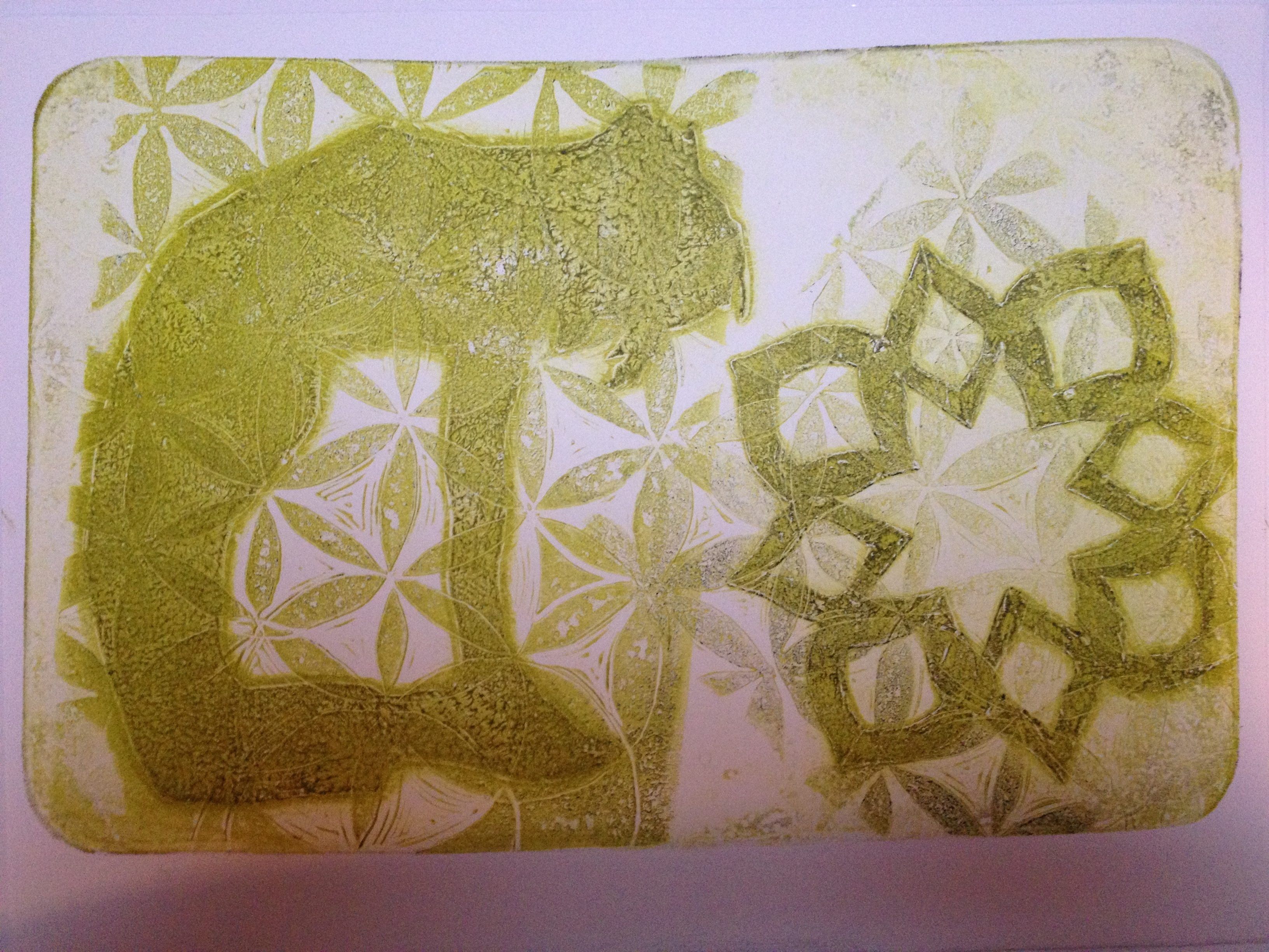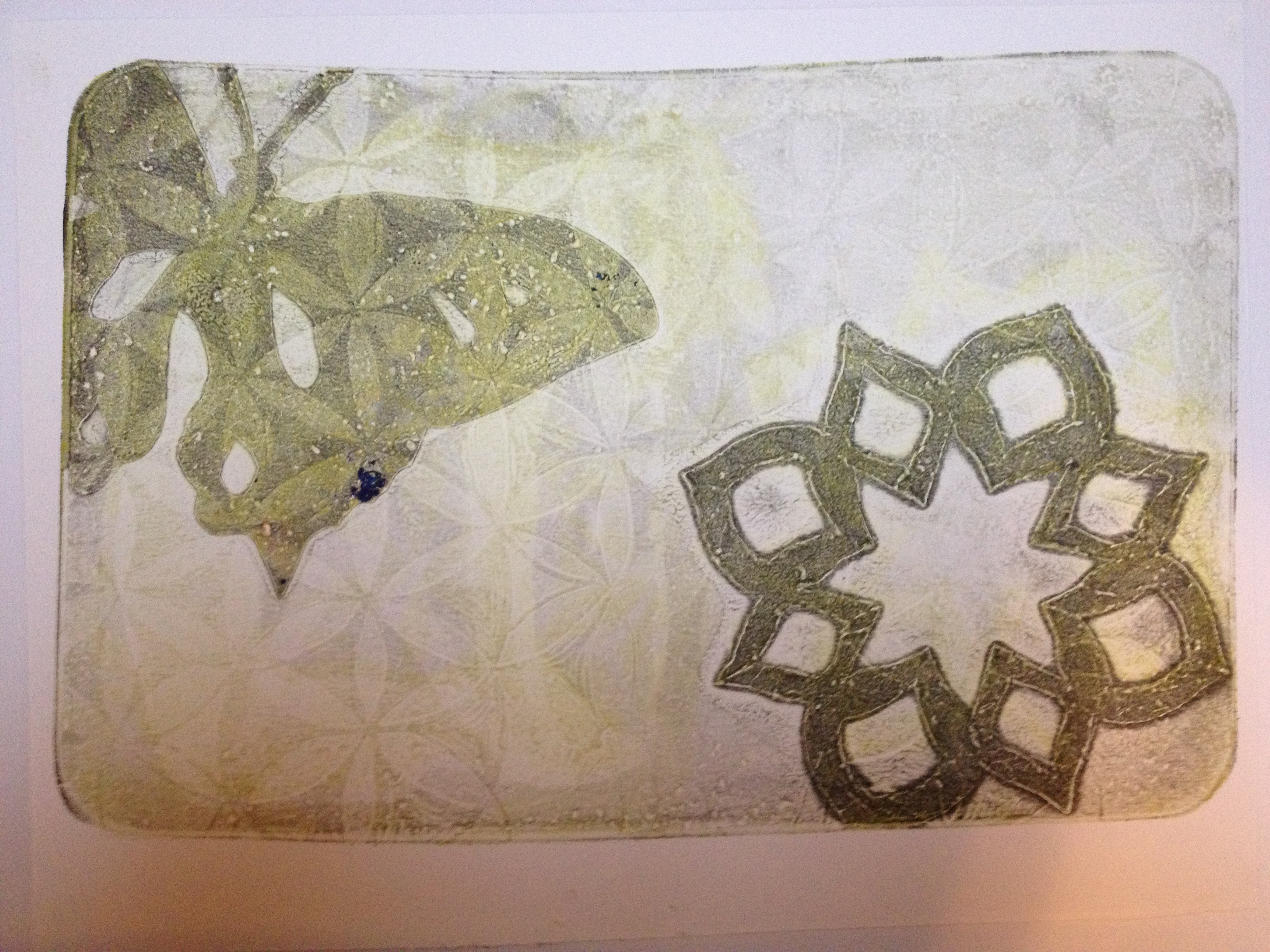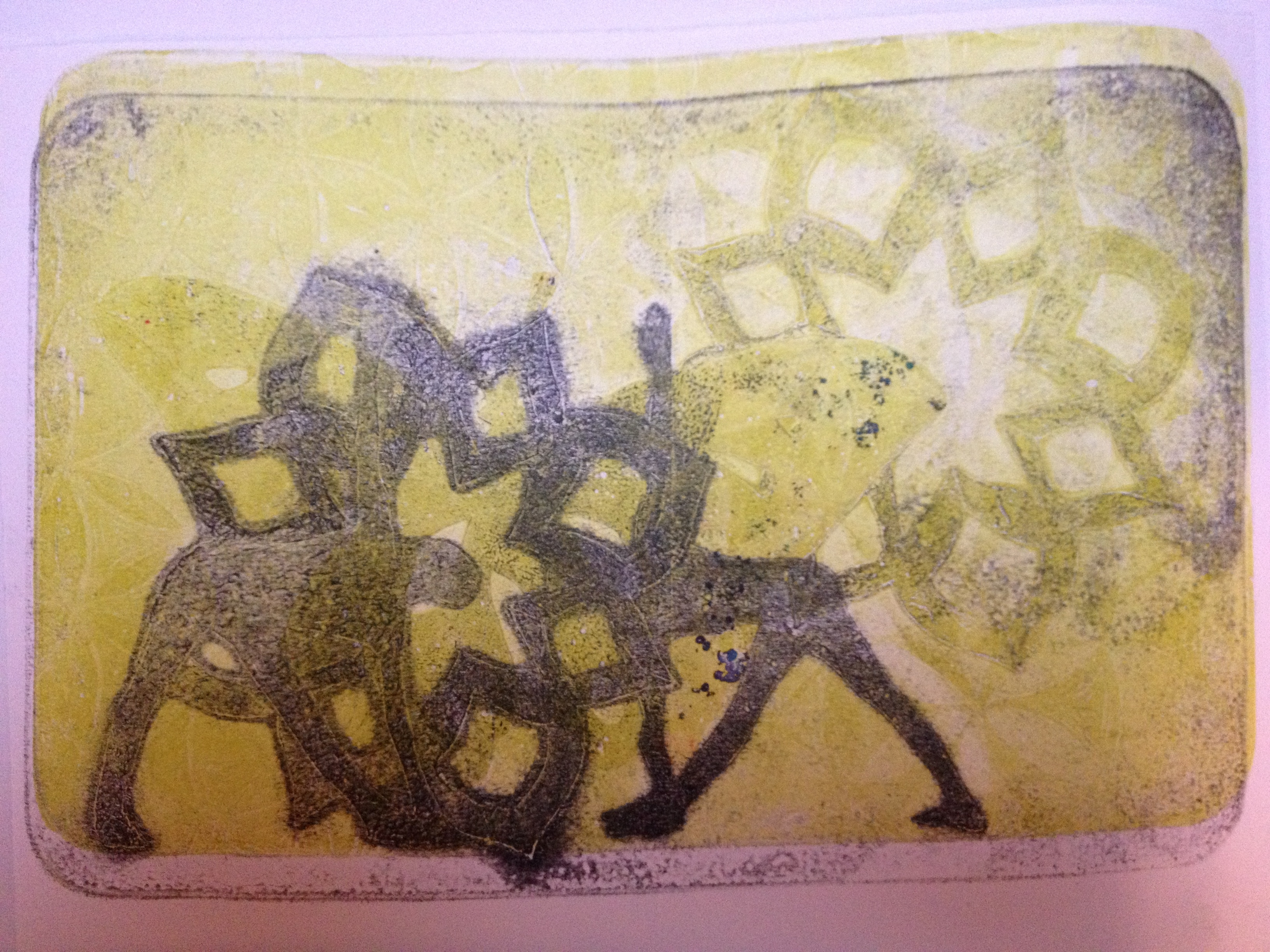 A shape print is the first print you pull off your plate.  The 2nd print is a detail or a “ghost print.”  In gelatin printmaking, the yummy details are often in the ghost, so it was a challenge to make interesting compositions by layering shape prints.  Mostly I was easily tempted to add detail with stamps, which was cheating a little, but I did a few straight up.