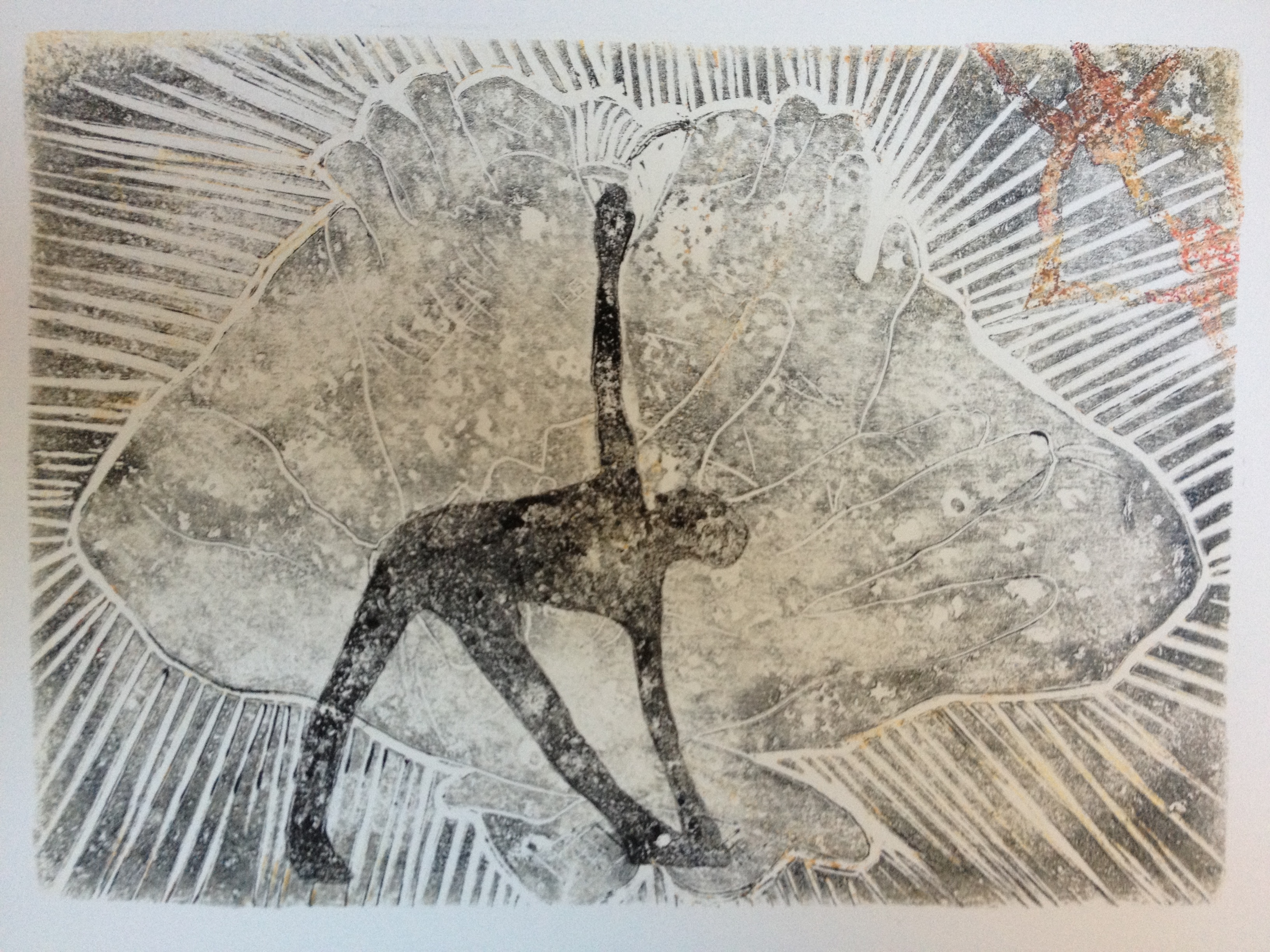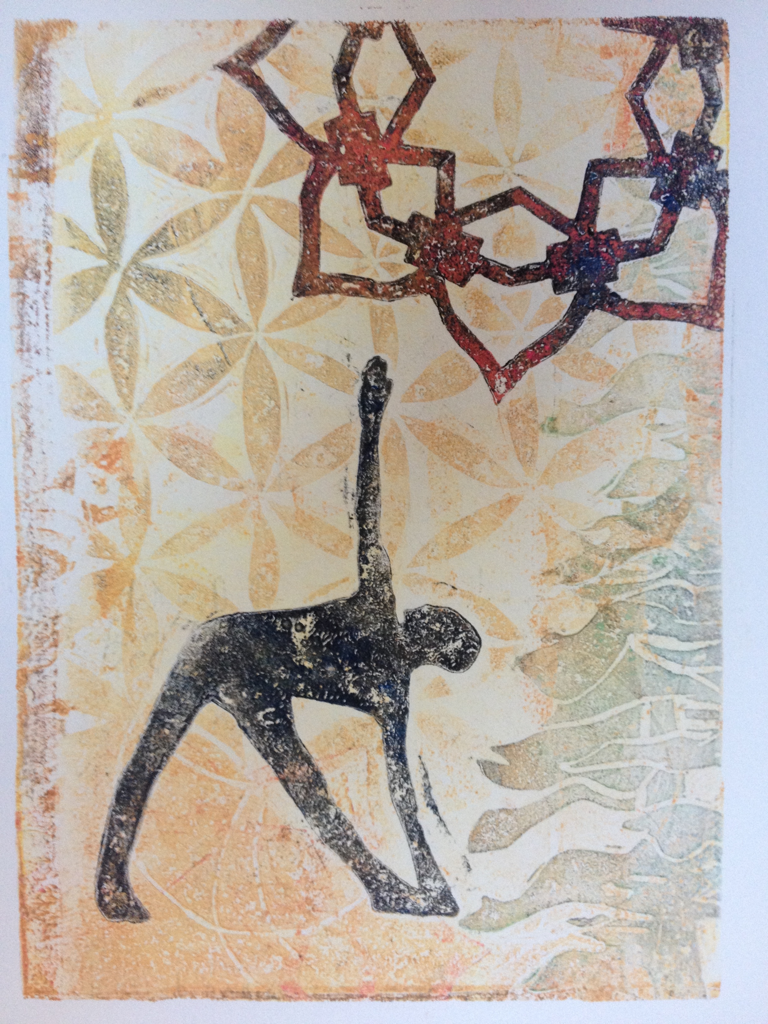 Below we have the David Swenson Trikonasana stencil.  I have two, one in mylar and one in coated paper.  The “flower” stencils come from a book called The Art of Decorative Paper Stencils by Kanako Yaguchi.  I’m working with Linda Germain’s exercise on inking the stencils, and I also cut a registration plate and found it easy to work with.  Although I like the clean edges, I’ve long been a fan of the wavy edges of the gelatin plate.  I guess in my own way it seems a bit subversive, not so much escaping the tyranny of the rectangle, but gently subverting it. Gentle subversion is more my style.