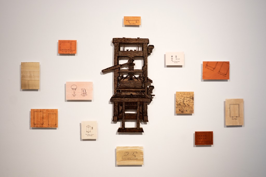 Colonial Impressions, woodblock plate and silkscreen prints mounted on panels, dimensions variable, 2023.