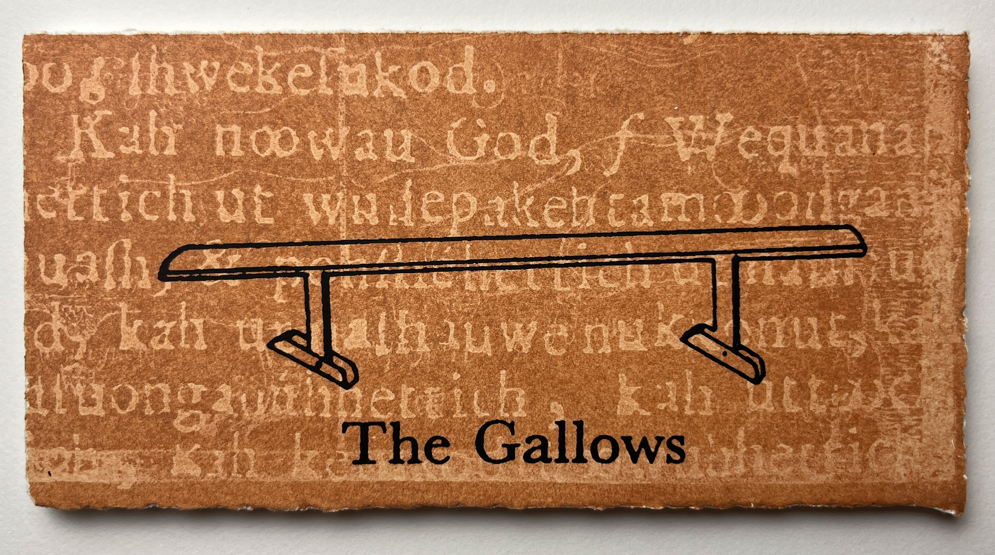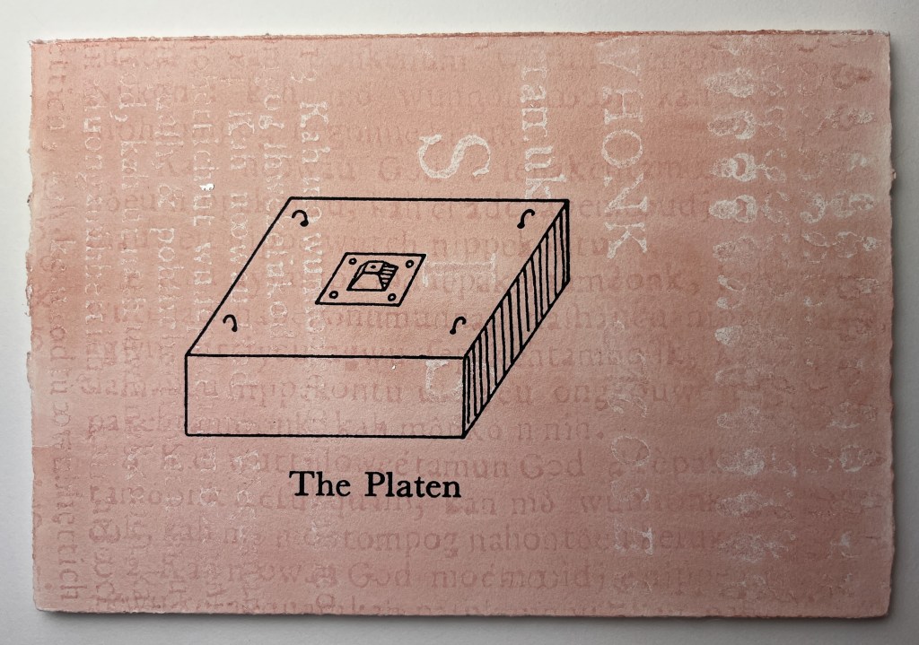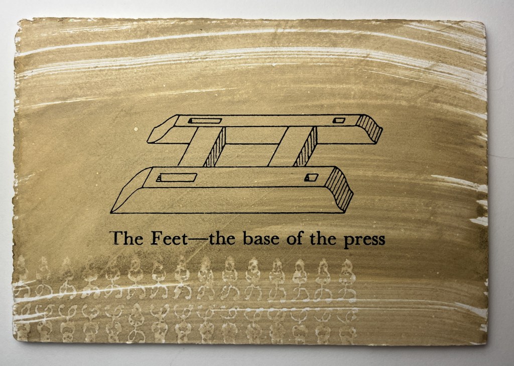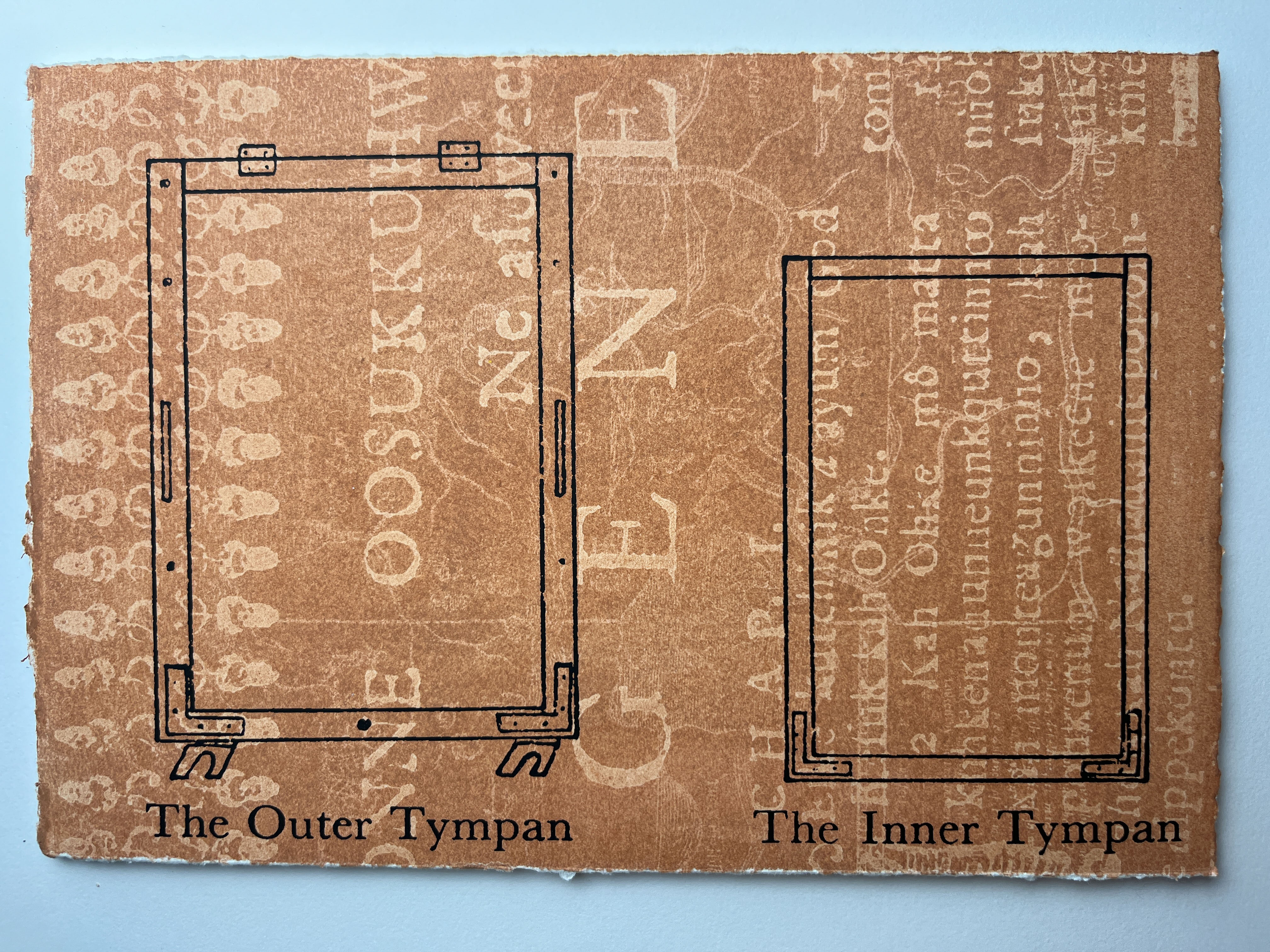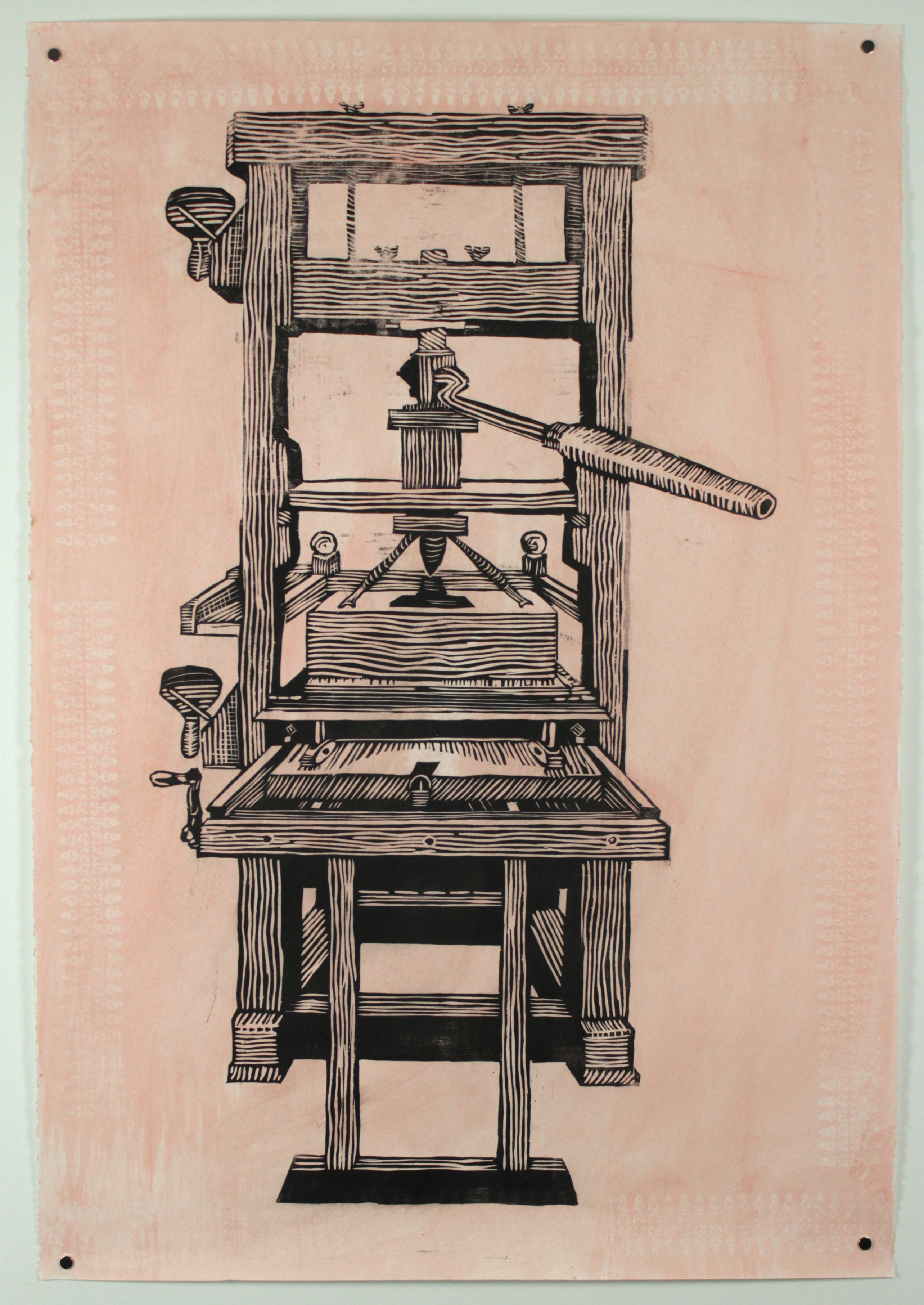I used images and diagrams in the book to address colonial legacies that haunt us today, eventually carving the press from a maple plywood plate and surrounding it with images of the parts of the press printed over paper prepared with oak gall ink made from galls found in the woods near my home. Two years in the making, this is the artist’s version of a Land Use Acknowledgement that I set out to make when I began graduate school.