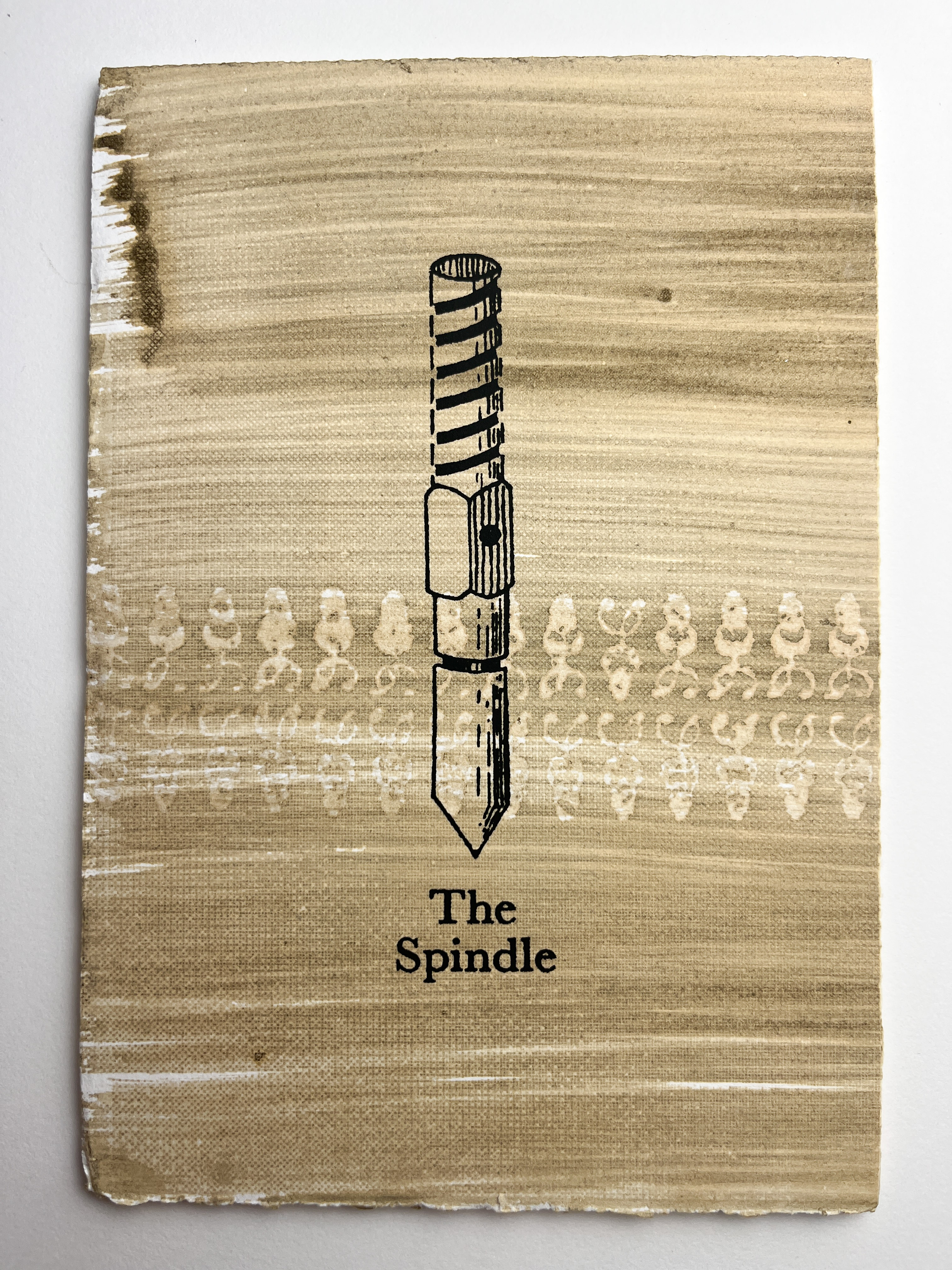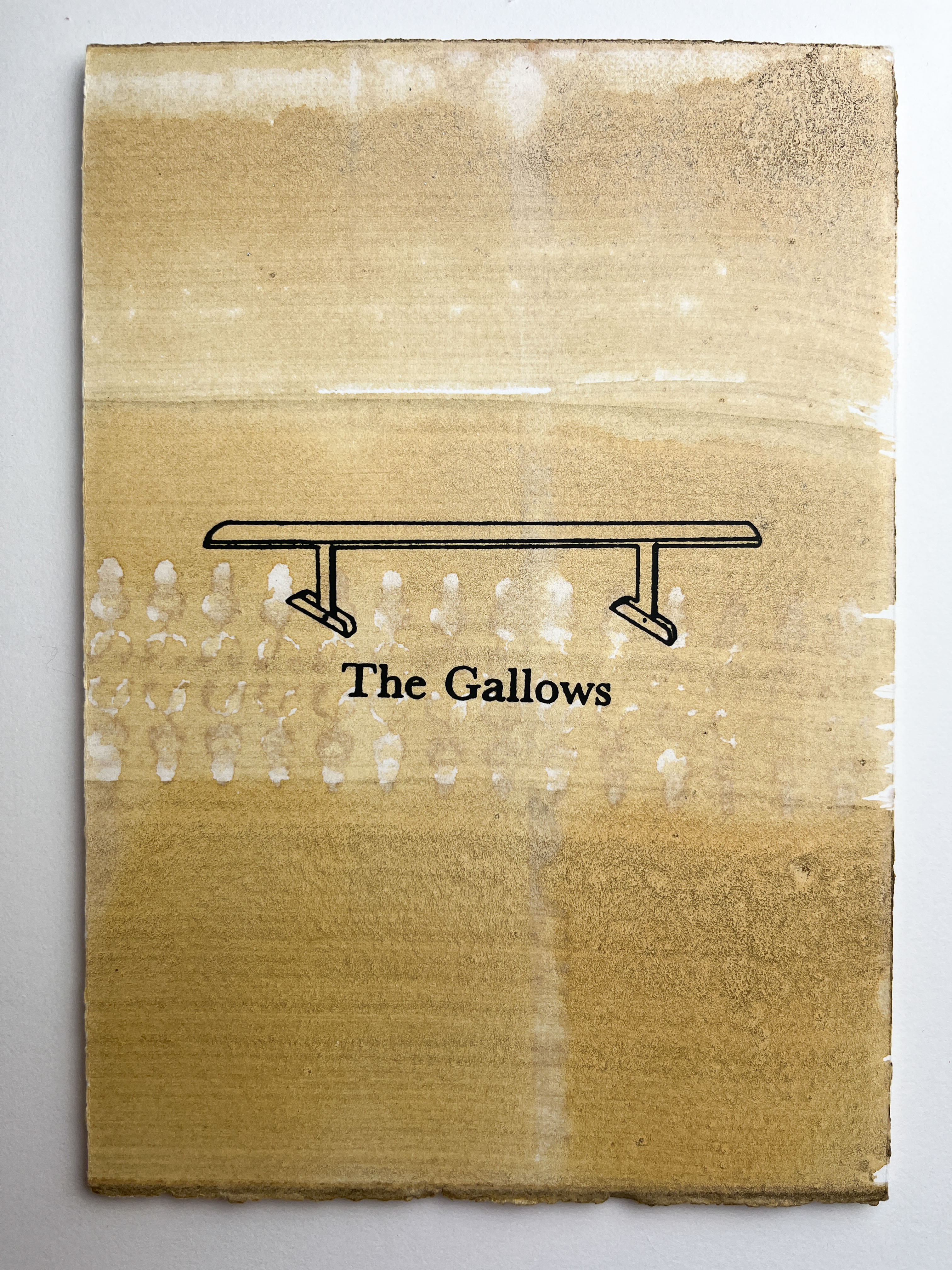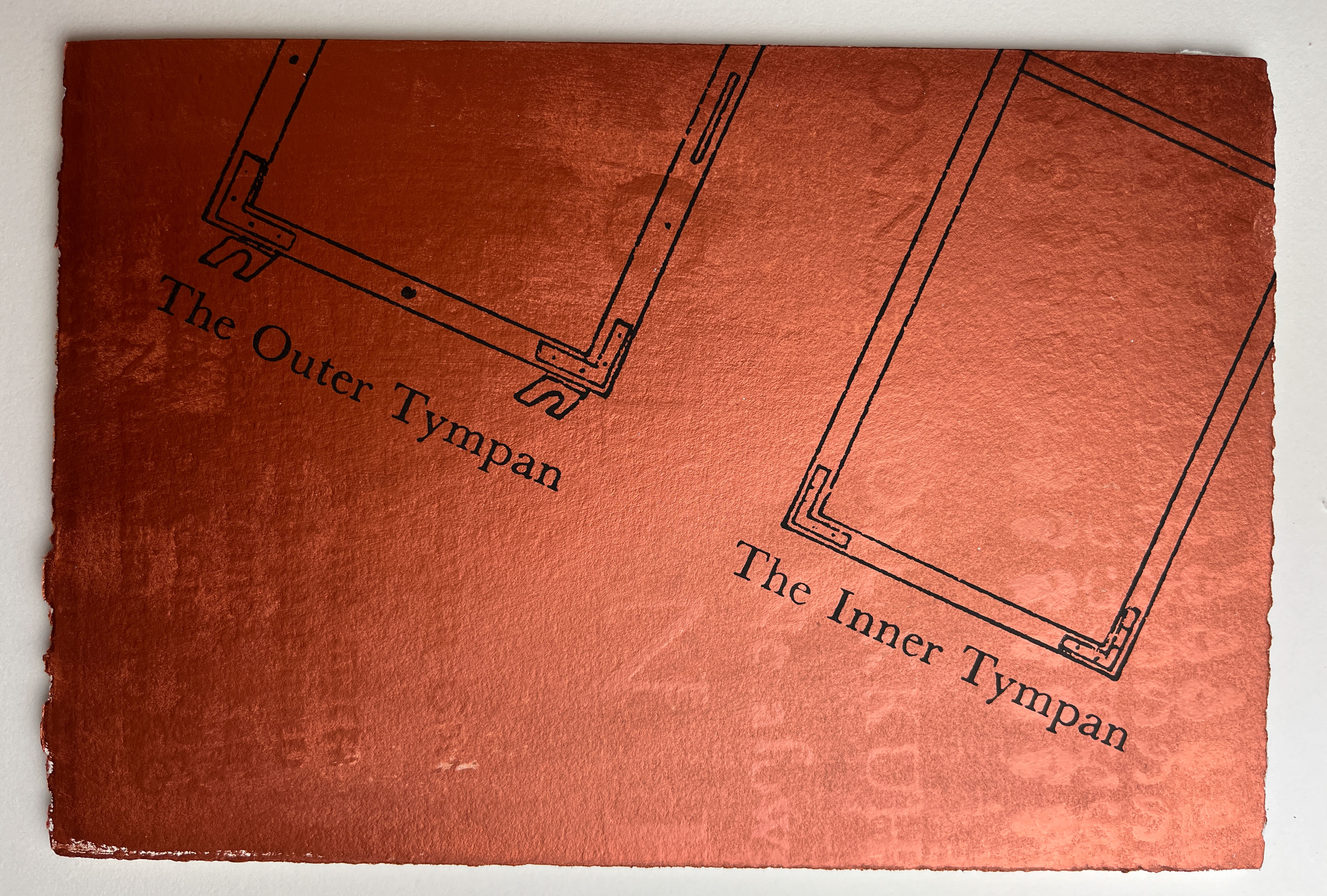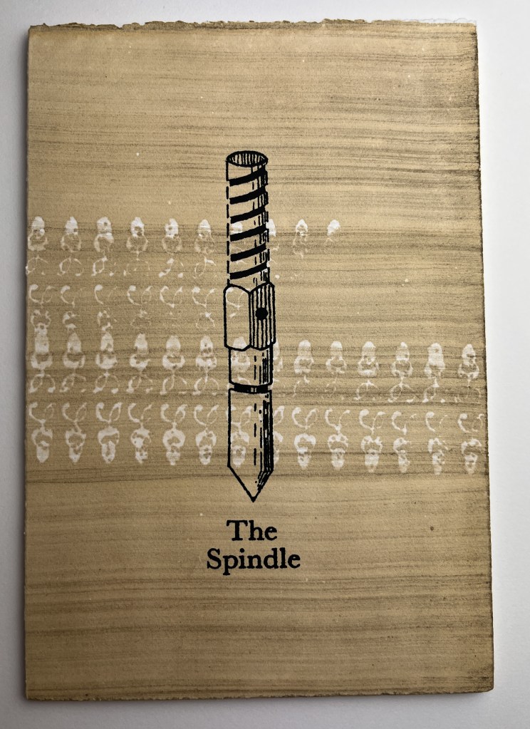 I used images and diagrams in the book to address colonial legacies that haunt us today, eventually carving the press from a maple plywood plate and surrounding it with images of the parts of the press printed over paper prepared with oak gall ink made from galls found in the woods near my home. Two years in the making, this is the artist’s version of a Land Use Acknowledgement that I set out to make when I began graduate school.