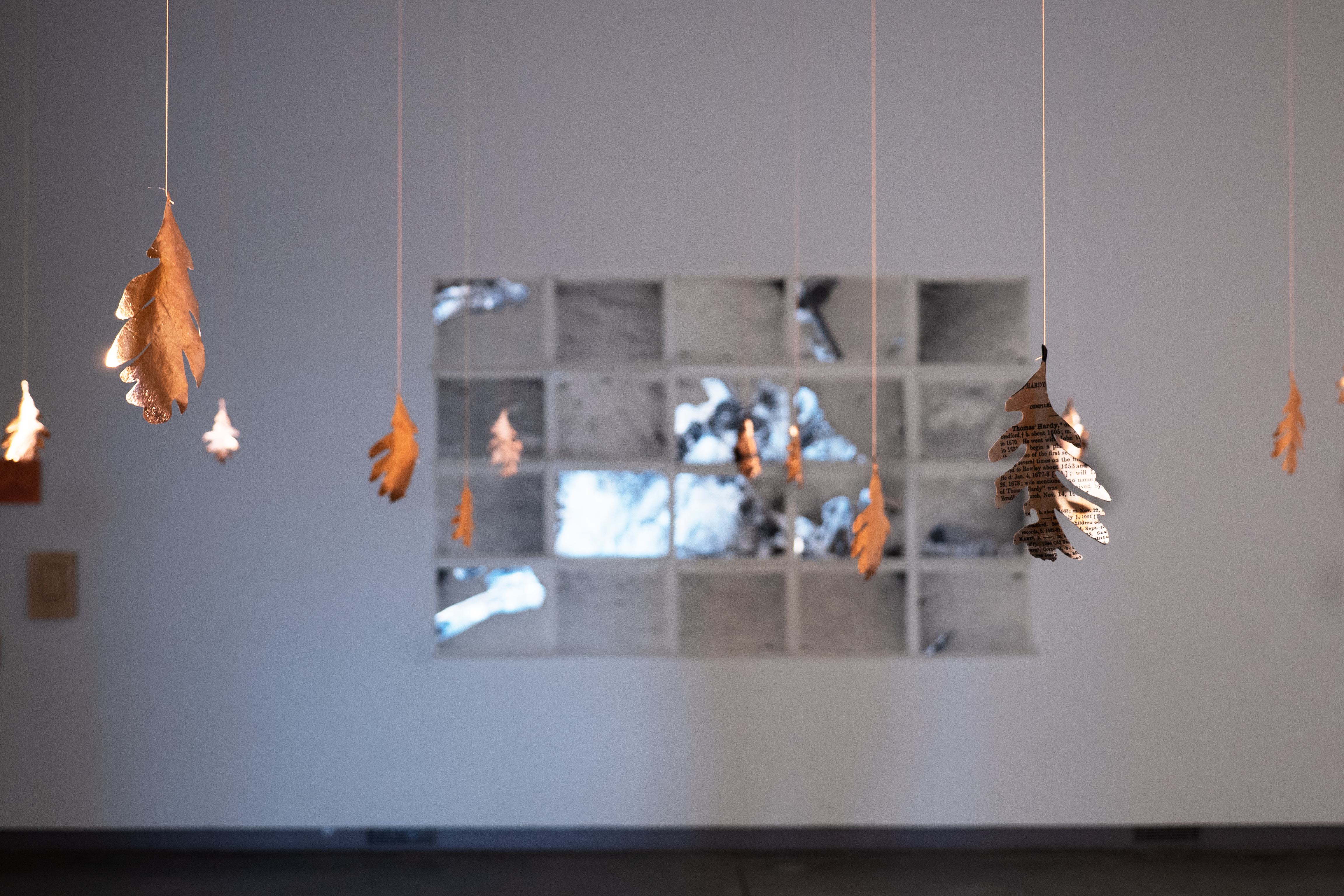 …the leaves in Copper Leaf Leaves become screens—sites of projection. I sift through written histories from a colonial ledger and project the evidence of Indigenous presence and of Indigenous/colonial interactions and situate the copper sheathed leaves, now raised to eye level, in an architectural imaginary. The entire installation becomes a site of projection, enticing the viewer to enter into a realm that bridges forest and grid. The leaves are imbued with memory and materiality, inviting the viewer to partake.