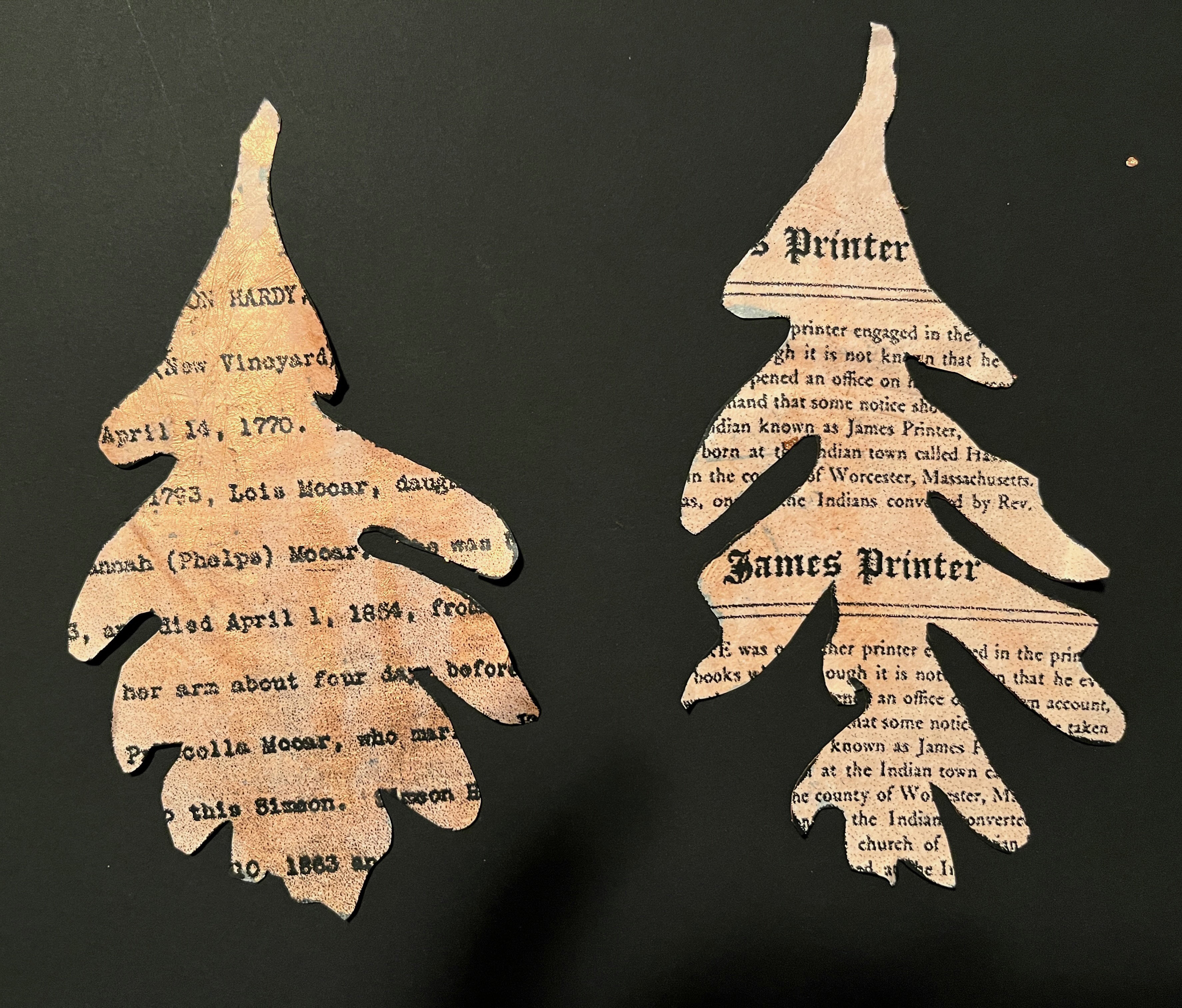 The histories and lost tales on these leaves relate to the history of New England at a moment when Indigenous peoples were fighting for their land and their livelihoods in a corner of the Americas that curls around the sea, my genealogy through my father’s line; the Hardys and their interactions with native peoples in Maine, and in particular the stories of James Printer, Weetamoo, and King Phillip’s War which I understand, what little I think I understand at any rate, through the lens of the book Our Beloved Kin, by Lisa Brooks.