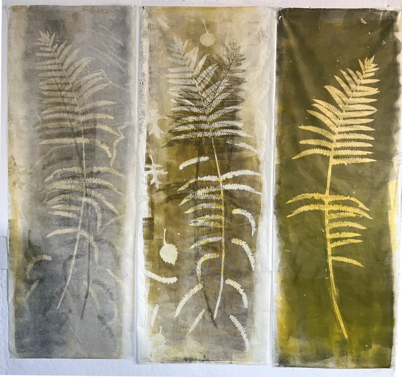 Trifecta (working title): The Neuron Forest, gelatin printed ferns, Golden open acrylic on kozo paper, 58 inches tall by 48 inches wide, 2023.